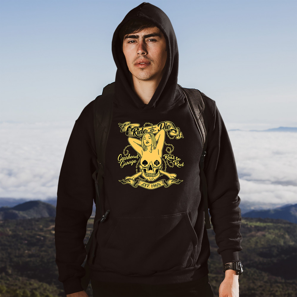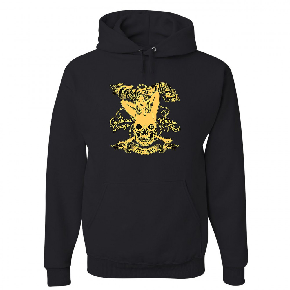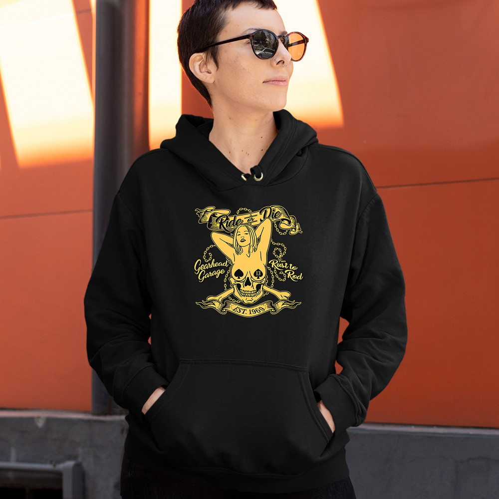 A print featuring a naked woman with her hands behind her head and spades as nipple covers. Her body is mixed with a skull. There are crossed bones and multiple chains in the background. The print says: "Ride or Die, Gearhead Garage, Rust to Rod, Est. 196
