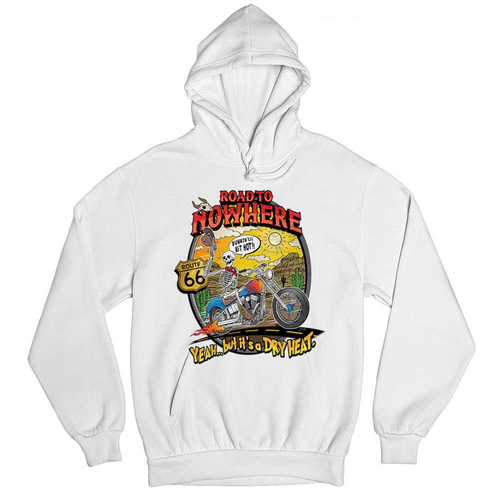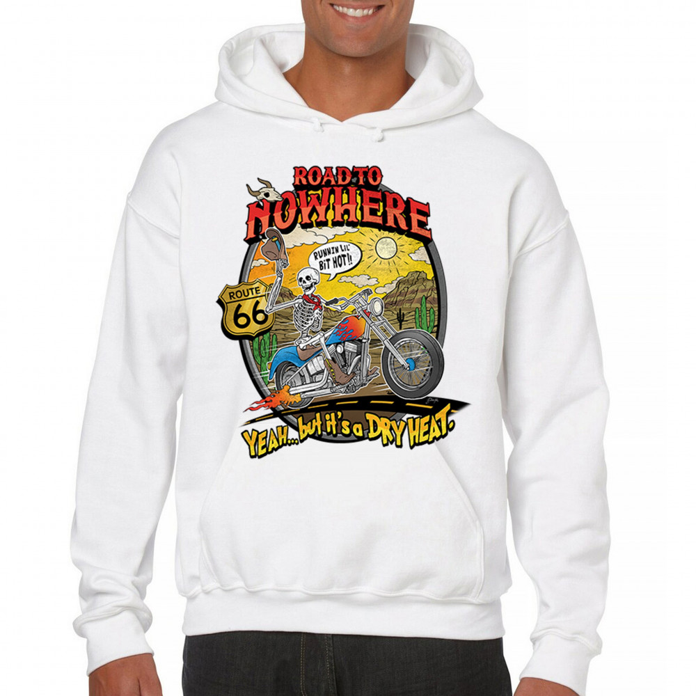 Discover the 'Road to Nowhere' T-shirt: a blend of bold graphics and adventurous spirit. Embrace the ride with our Route 66 skeleton biker design.