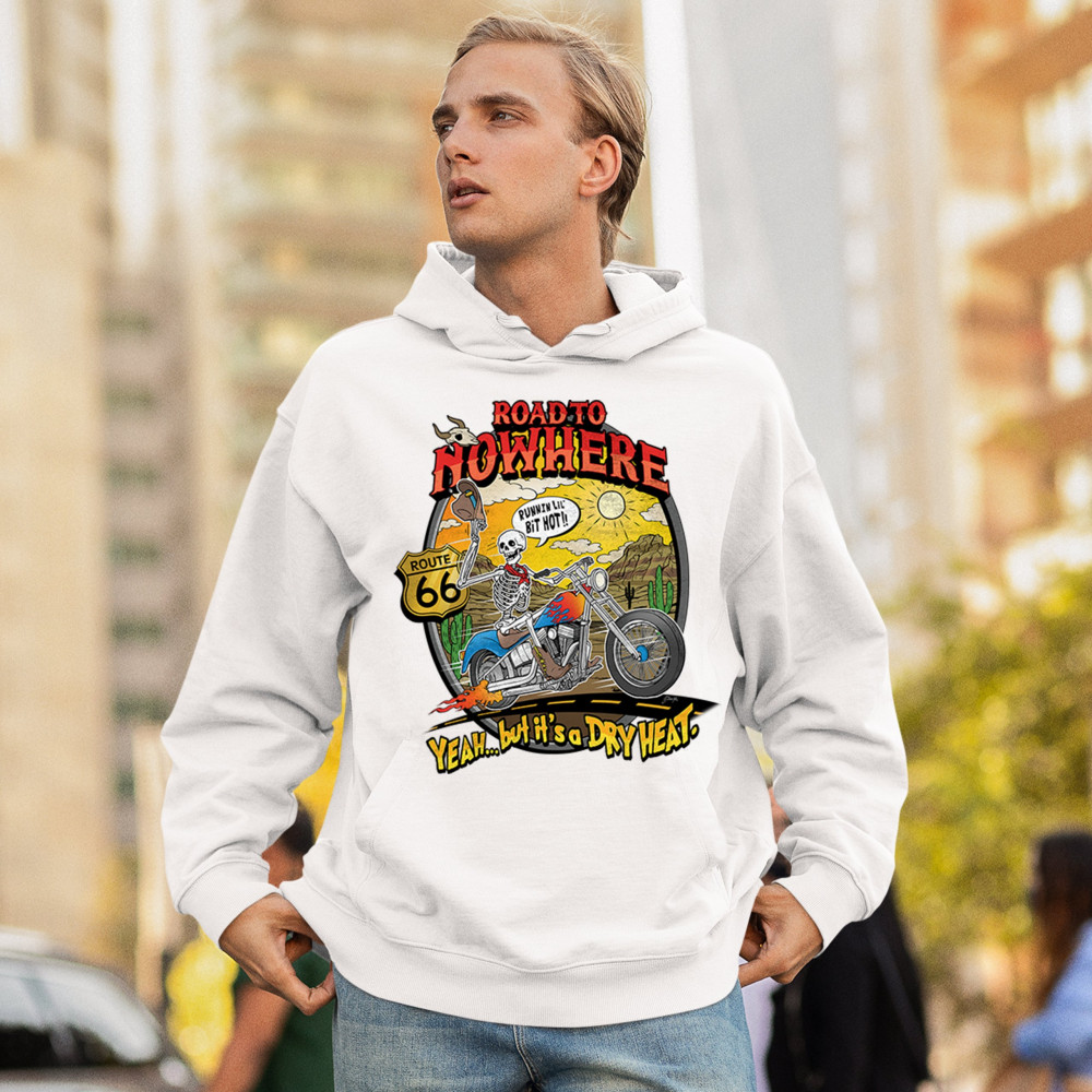 Our 'Road to Nowhere' tee is a salute to the thrill-seekers and the heat-bravers. Adorned with a bold skeleton cruising down Route 66, it embodies the spirit of adventure with a touch of playful defiance. A statement piece for anyone who lives for the ride and laughs in the face of danger. Join the ride into the sunset with this daring design.