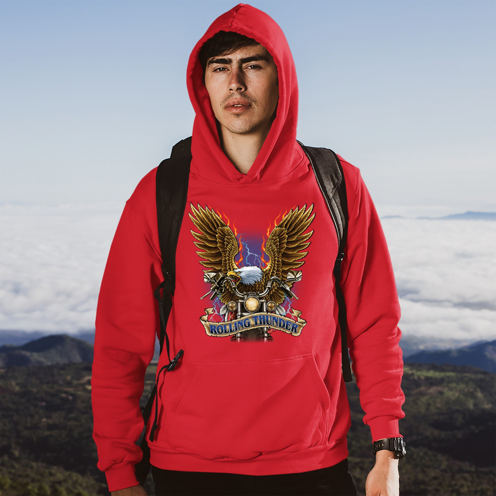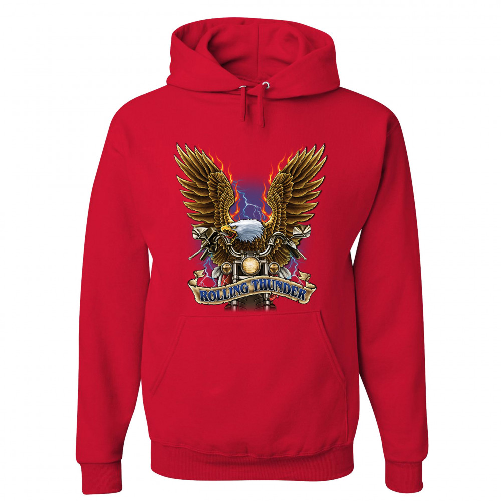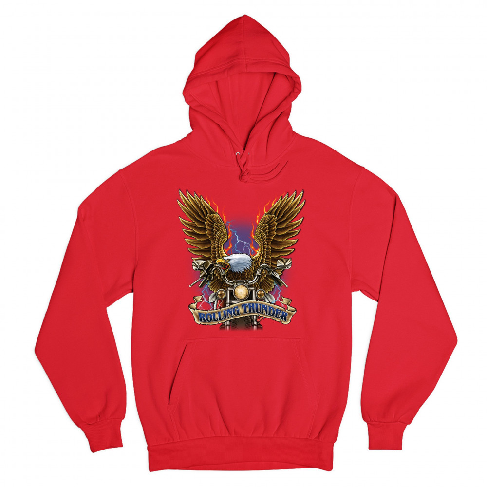 A print featuring an American bald eagle riding a motorcycle and spreading it's wings while they're on fire. In the background a lightning strikes. There is also stripe which says: "rolling thunder". A great choice for a motorcycle enthusiast.