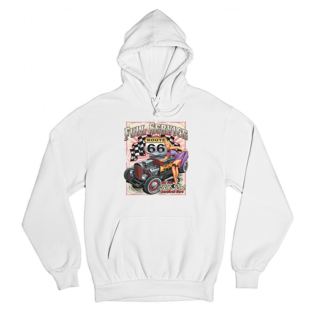 A print featuring a hot rod muscle car with flames painted on it's sides. There is a beautiful pin-up girl in stockings standing near it lifting her dress with one hand. The prints says: "full service" and "get your hot rod serviced here". In the background there is a Route 66 sign with racing flags to it's sides. Great for Route 66 and hot rod fans.