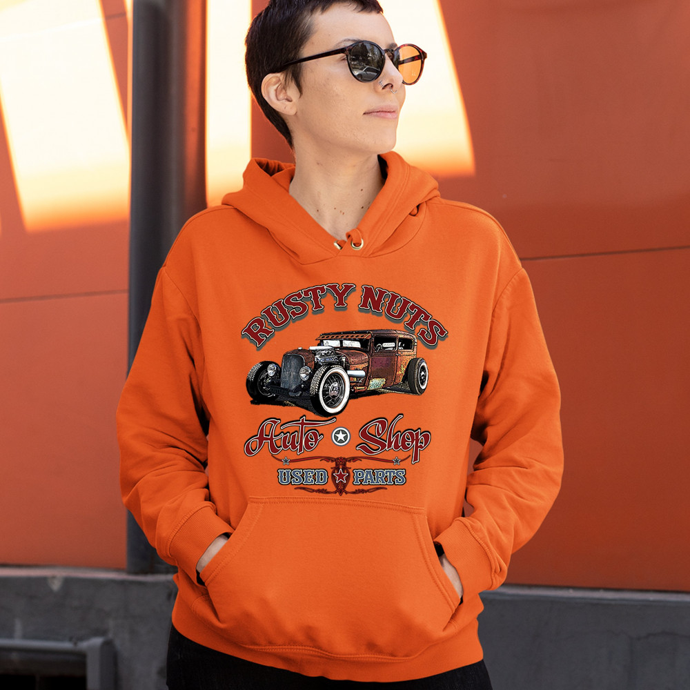 RUSTY NUTS AUTO SHOP sweatshirt hot rod rat rod vintage old school hoodie orange