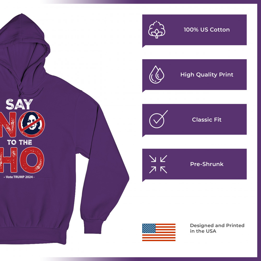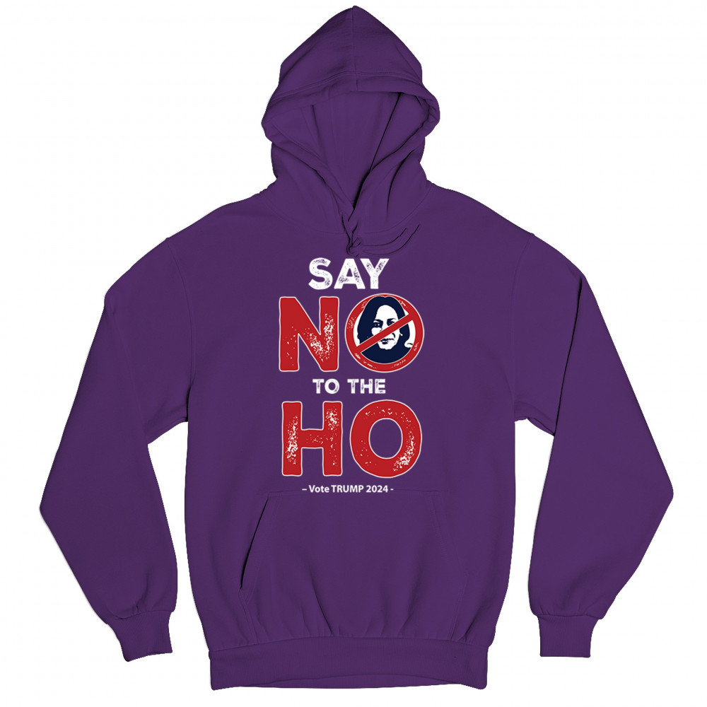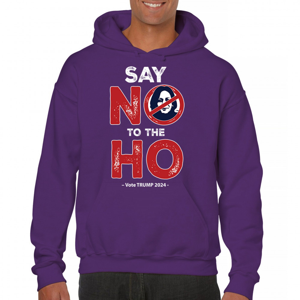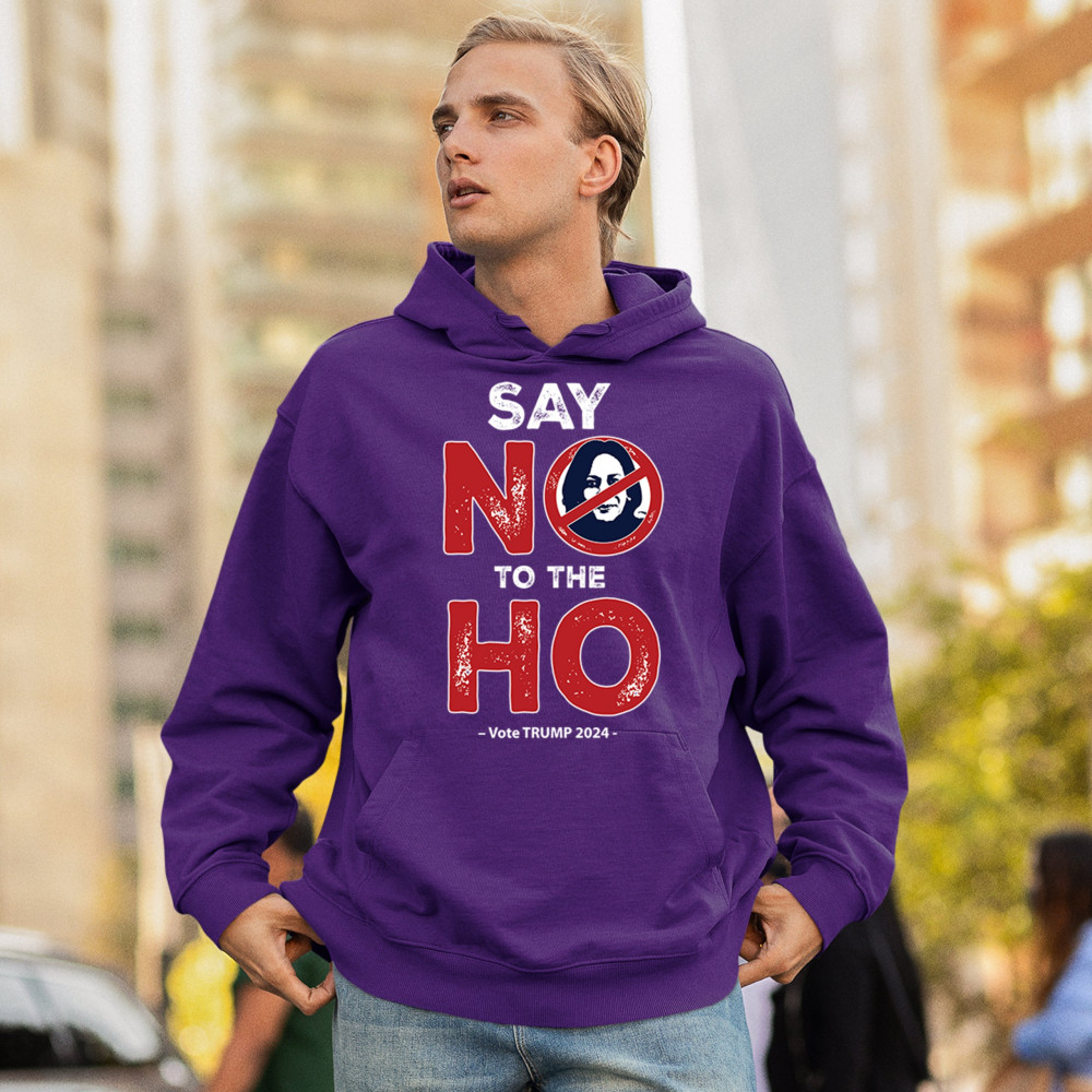 Show your conservative spirit with the "Say No to the Ho" print, perfect for rallies or daily wear. Support Trump-Vance 2024 and Make America Great Again.