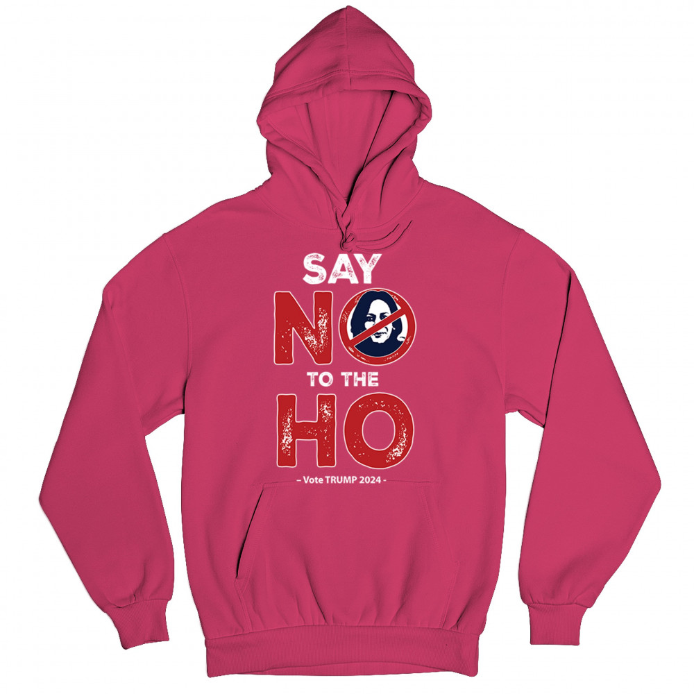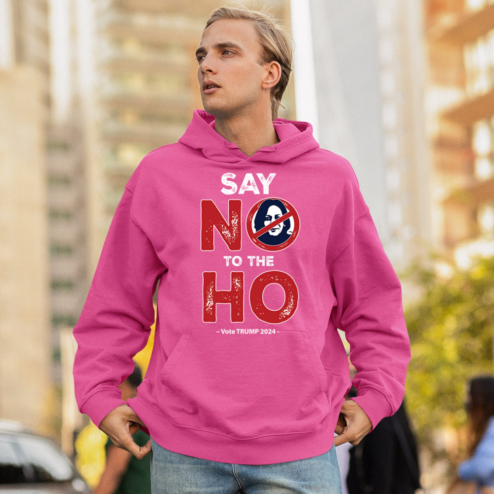 Show your conservative spirit with the "Say No to the Ho" print, perfect for rallies or daily wear. Support Trump-Vance 2024 and Make America Great Again.