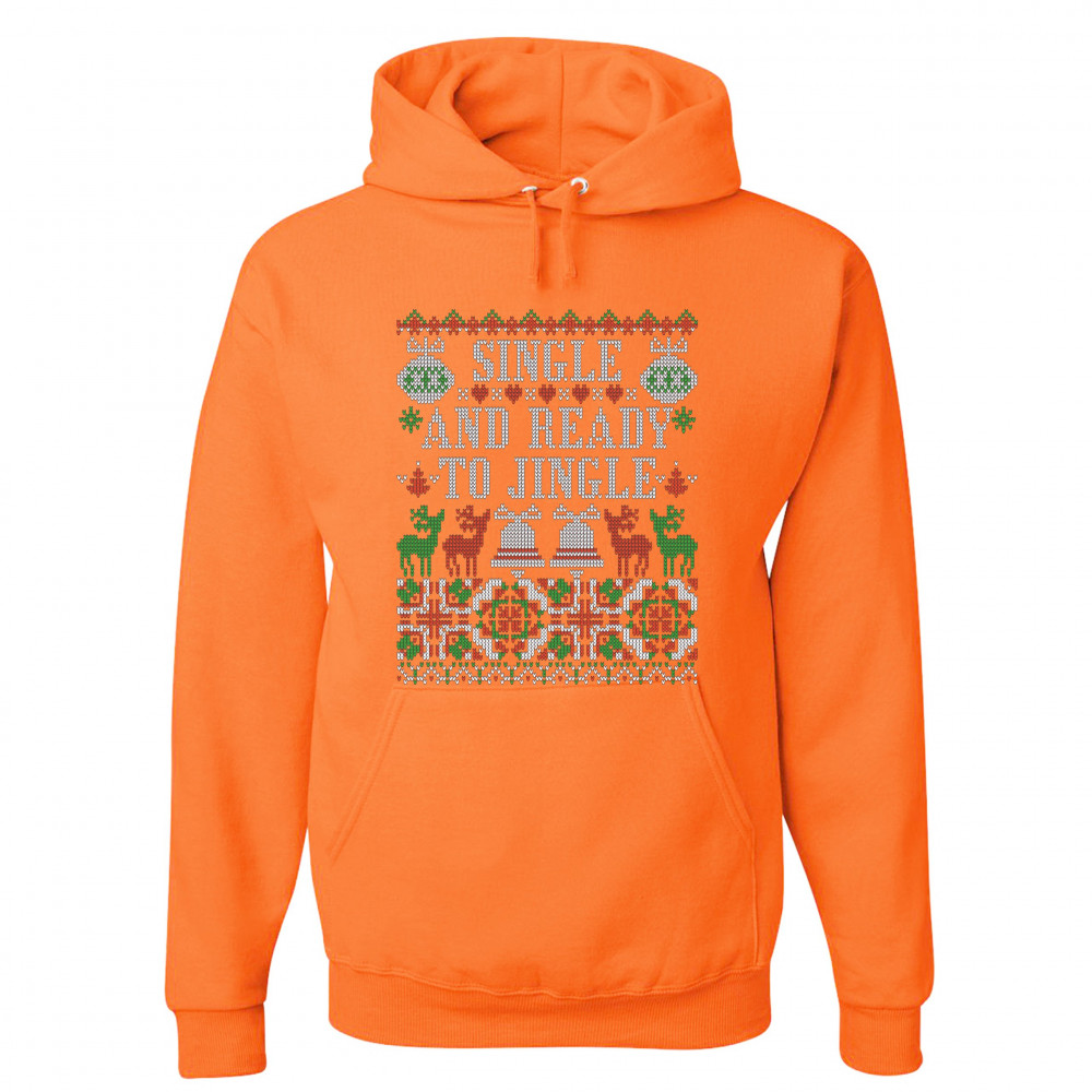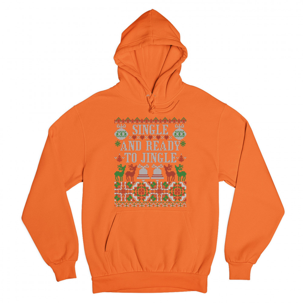 A print saying: "Single and Ready to Jingle" and featuring four reindeers and two Christmas bells. The print is designed as an ugly sweater. Amazing choice for a single person who wants to make people smile and spread positive vibes on Christmas Eve.