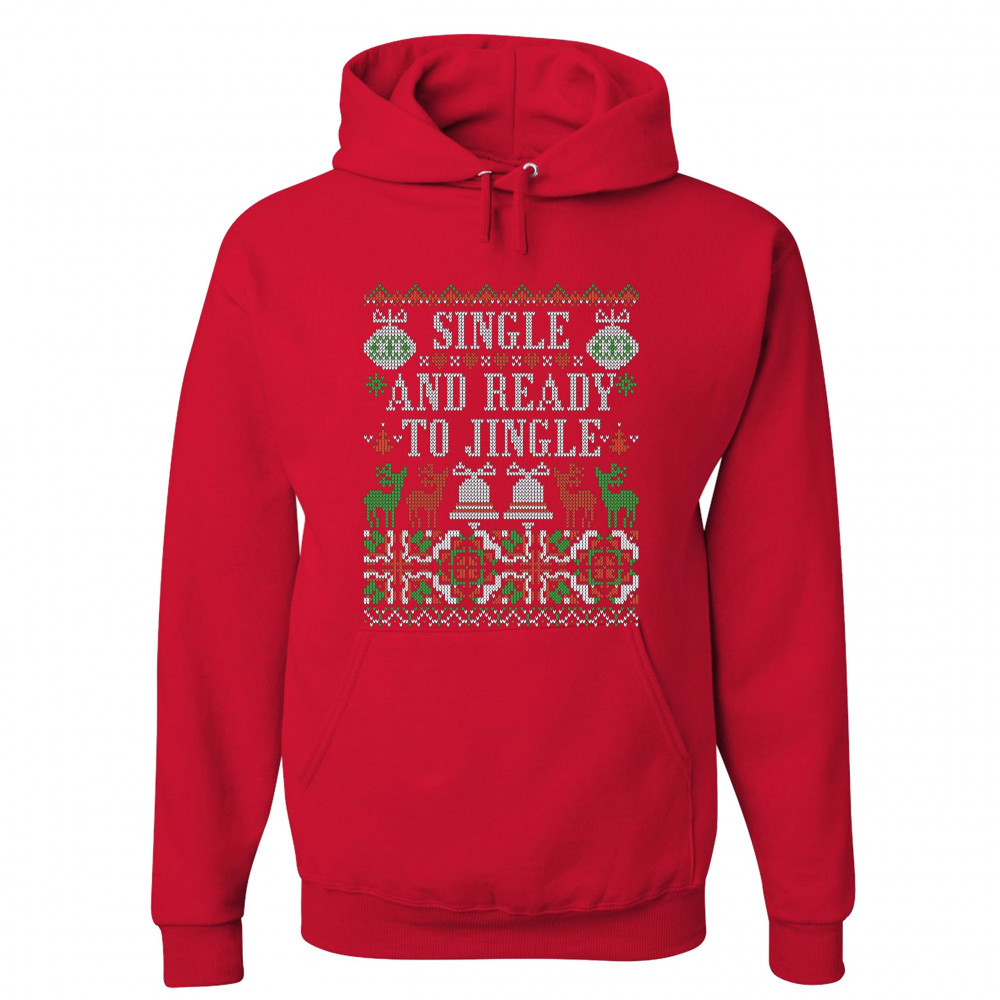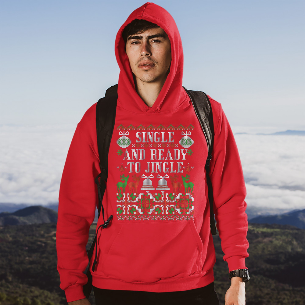 A print saying: "Single and Ready to Jingle" and featuring four reindeers and two Christmas bells. The print is designed as an ugly sweater. Amazing choice for a single person who wants to make people smile and spread positive vibes on Christmas Eve.