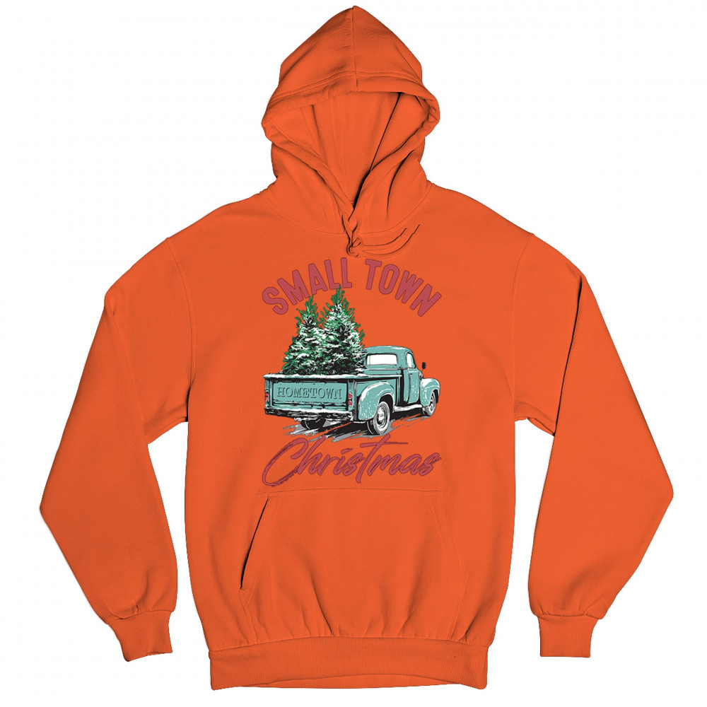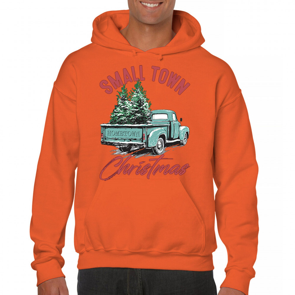 Embrace holiday nostalgia with this "Small Town Christmas" design featuring a vintage truck and Christmas trees. Perfect for rustic decor lovers.