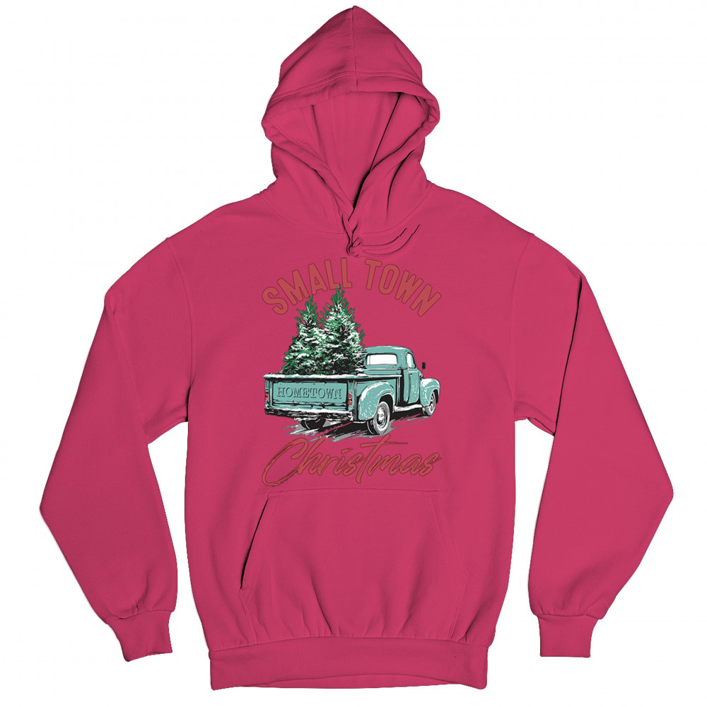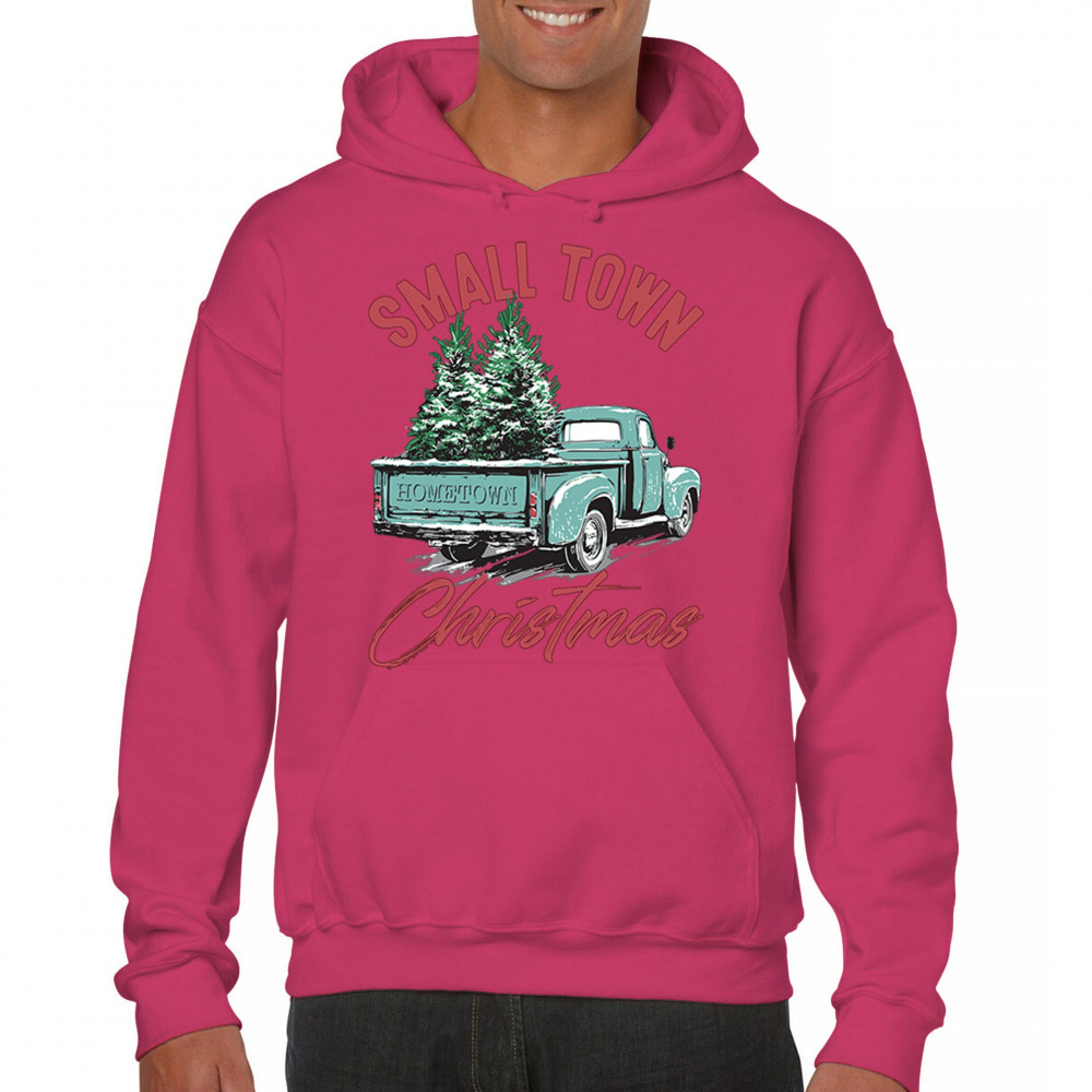 Embrace holiday nostalgia with this "Small Town Christmas" design featuring a vintage truck and Christmas trees. Perfect for rustic decor lovers.