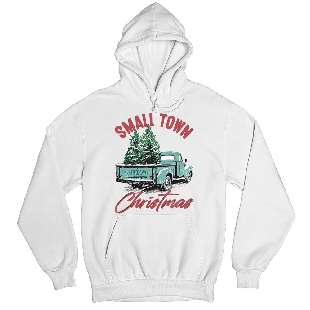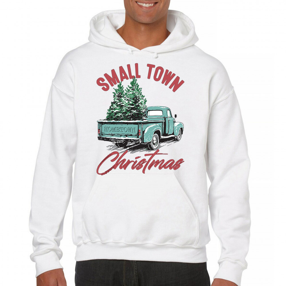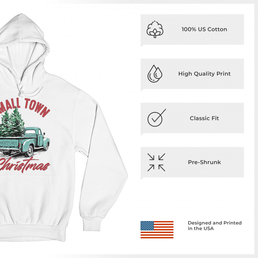 Embrace holiday nostalgia with this "Small Town Christmas" design featuring a vintage truck and Christmas trees. Perfect for rustic decor lovers.