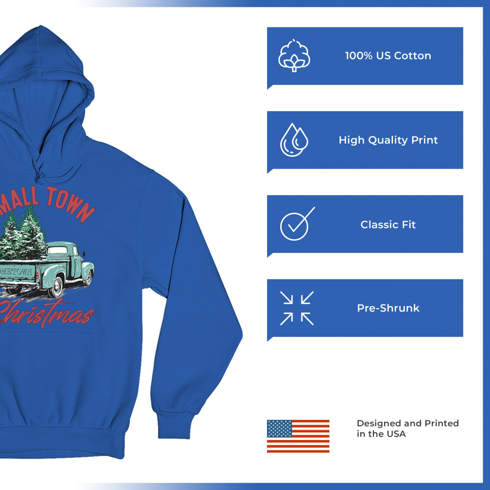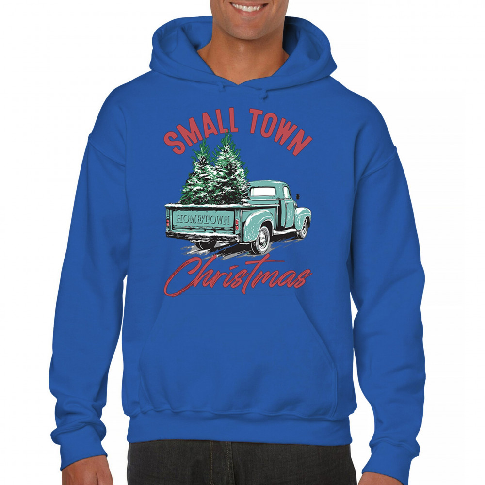 Embrace holiday nostalgia with this "Small Town Christmas" design featuring a vintage truck and Christmas trees. Perfect for rustic decor lovers.