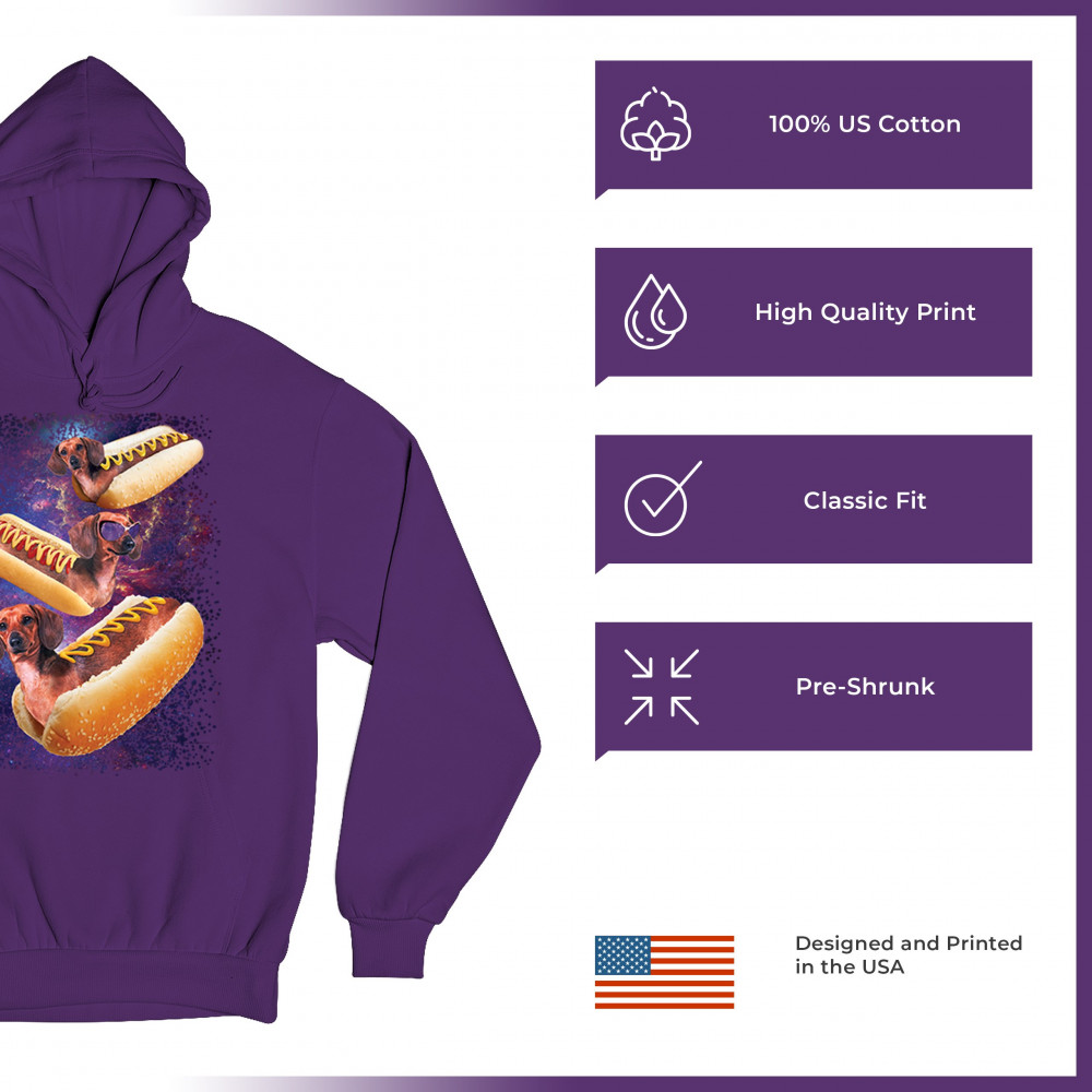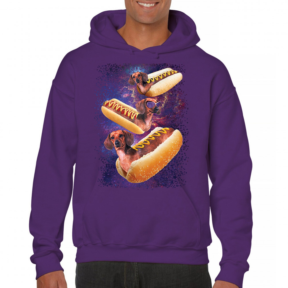 Quirky and fun tee featuring dachshunds as hotdogs in a cosmic setting. Perfect for dog and space lovers. Comfortable and durable.