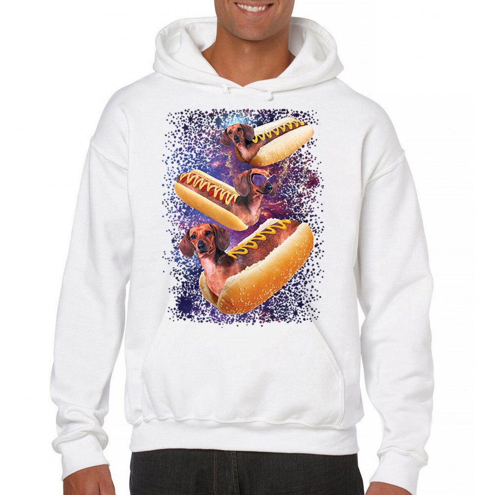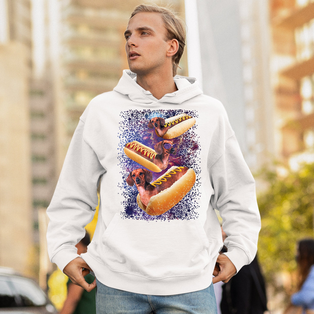 Add a dash of humor to your wardrobe with our unique design featuring adorable dachshunds as hotdogs in a cosmic setting. This playful graphic is perfect for animal lovers and those with a quirky sense of style. The vibrant colors and detailed illustration ensure you stand out in any crowd. Made from premium materials, this tee offers both comfort and durability, making it ideal for everyday wear or special occasions. Embrace your love for dogs and space with this fun and imaginative design.