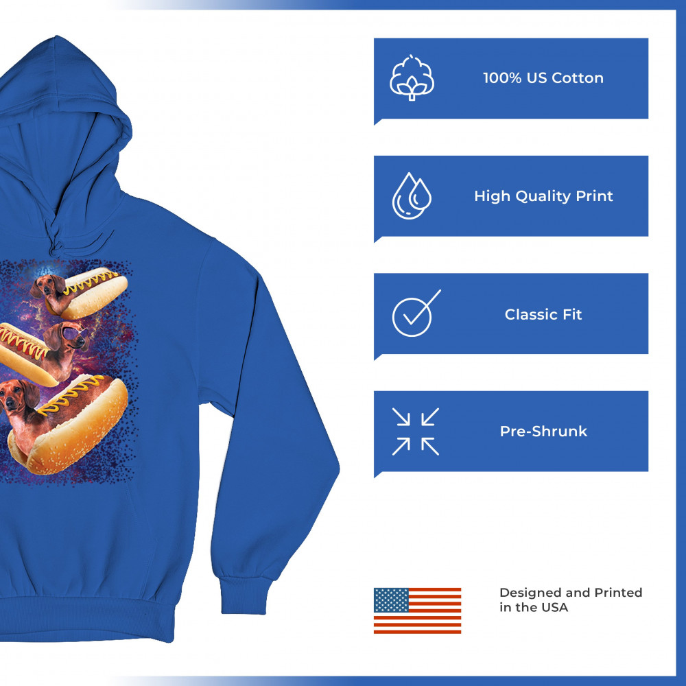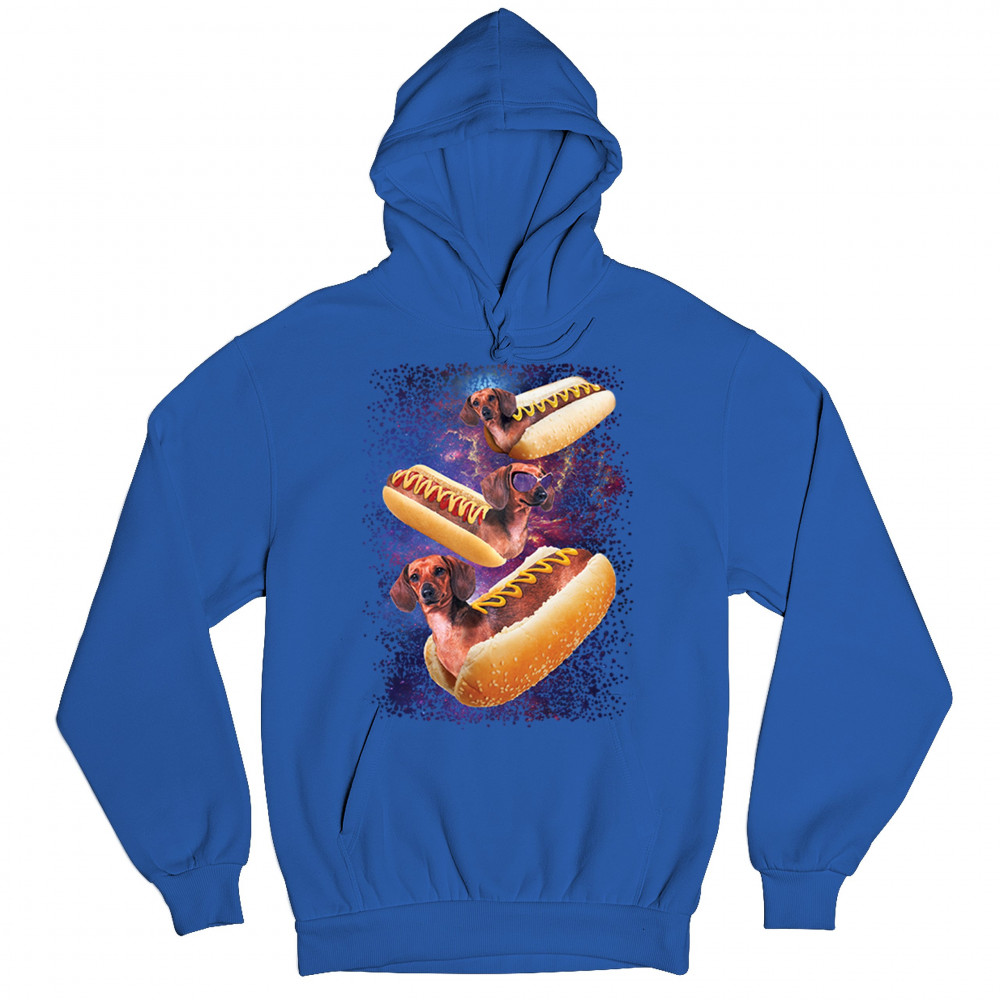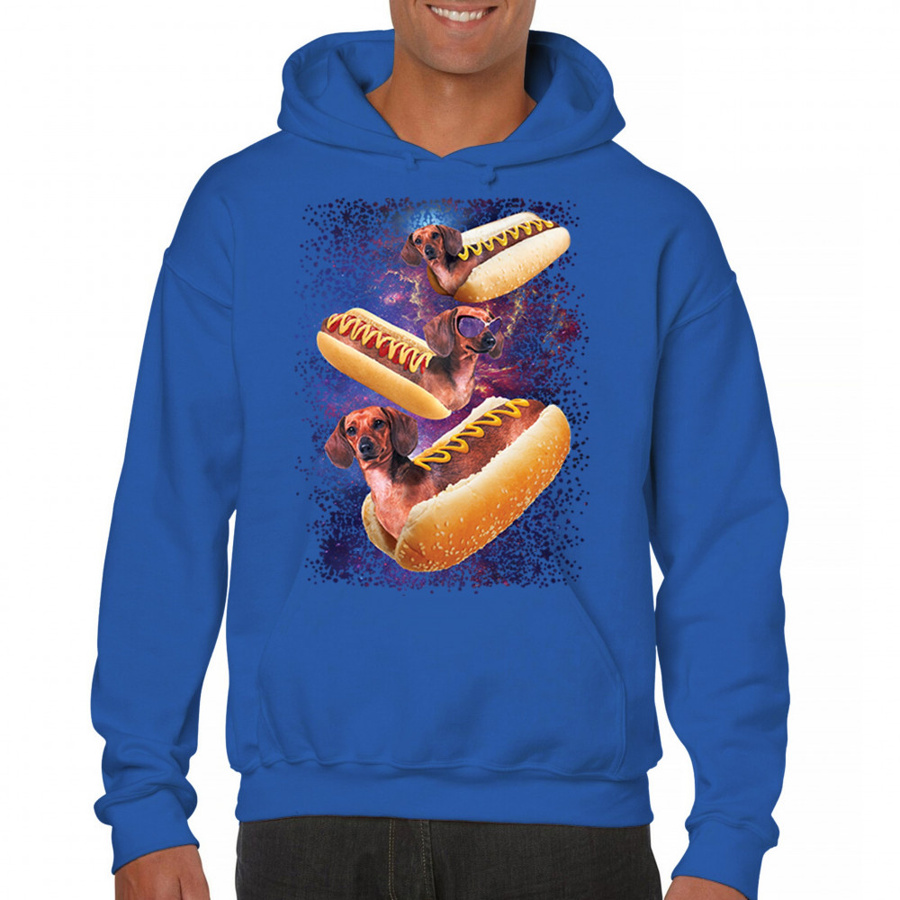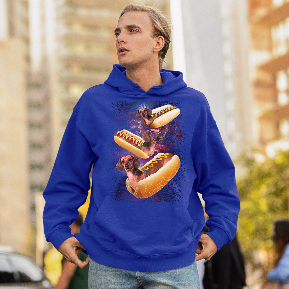 Quirky and fun tee featuring dachshunds as hotdogs in a cosmic setting. Perfect for dog and space lovers. Comfortable and durable.