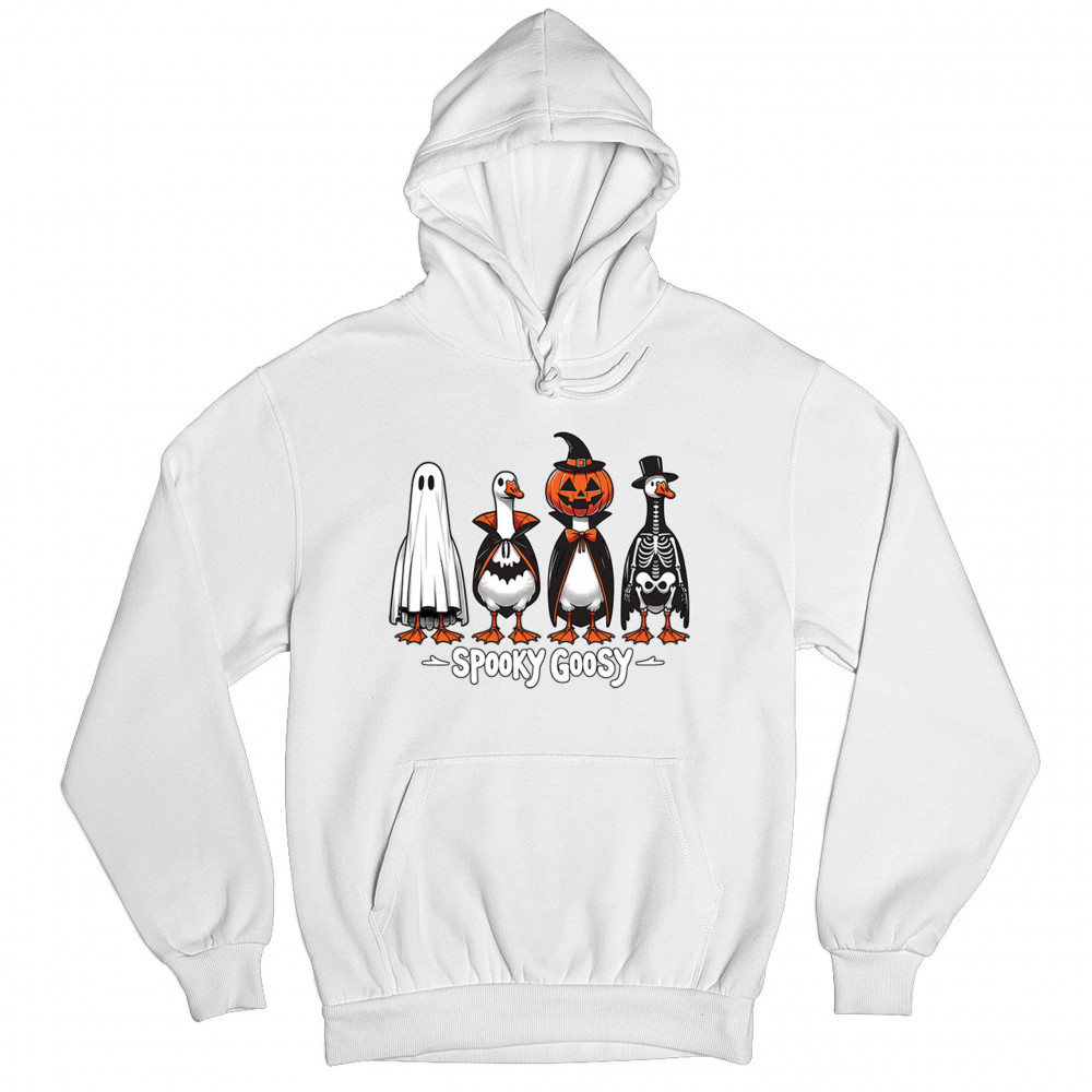 Spooky Goosy Halloween design with geese in witch, skeleton, vampire, and pumpkin costumes. Perfect for October 31, haunted house, and scary night fun.