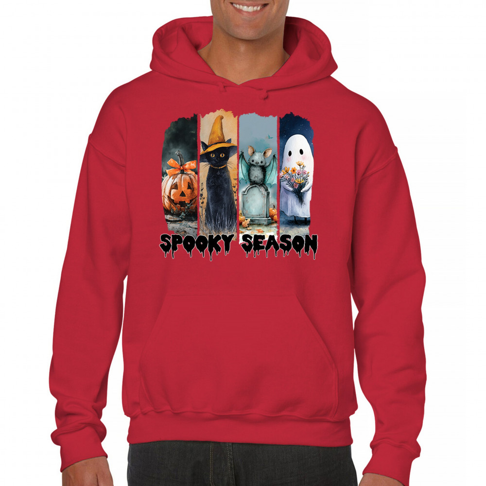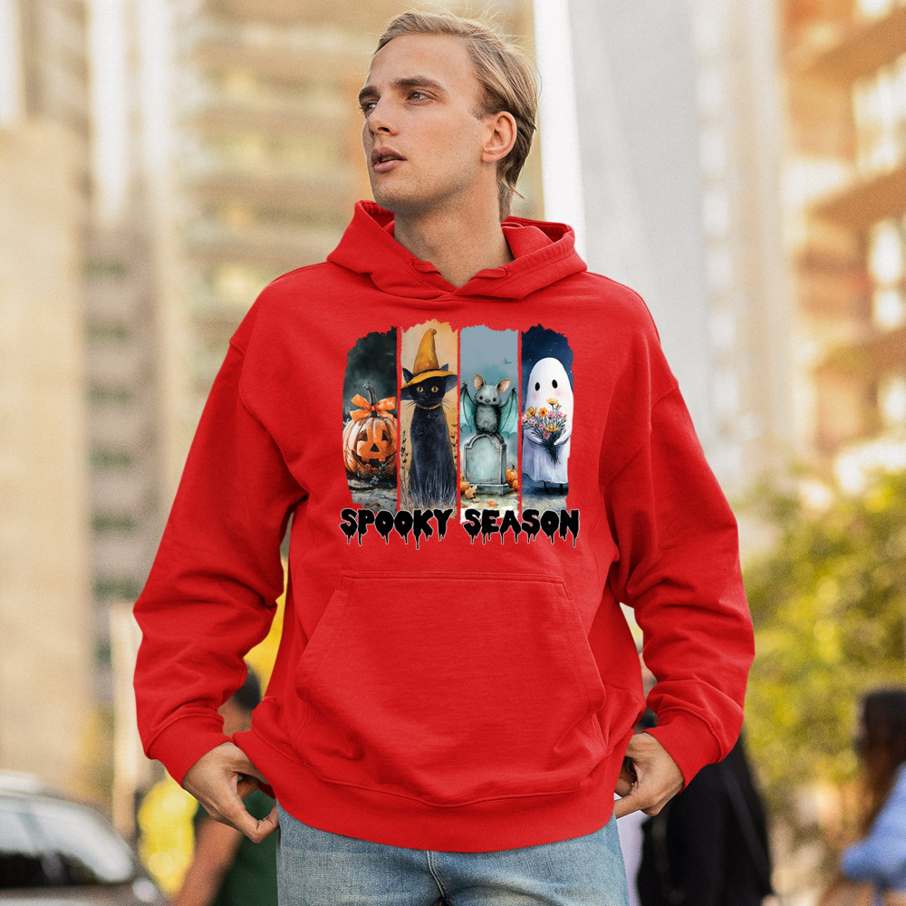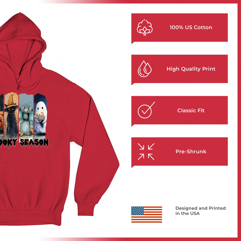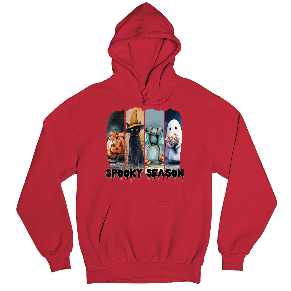 Spooky Season design with scary black cat, jack o lantern, haunted ghost house, and cute ghost. Perfect for October 31, trick or treat, and fall fun.