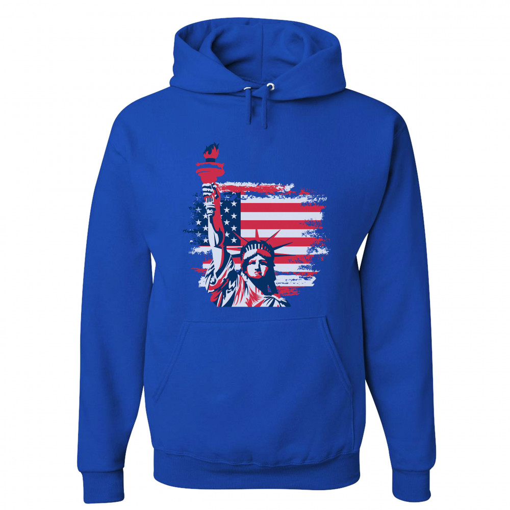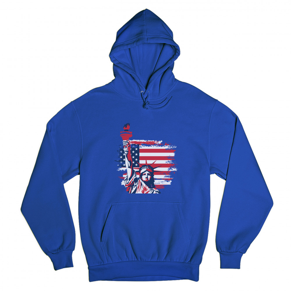 A patriotic print featuring a dripping silhouette of a bald eagle. The body is painted blue with lots of stars on it and the feathers of the wings, painted red, resemble the stripes of the American Flag. Over the wings there is a text written: "Land of the free home of the brave". Great choice to wear on Independence Day or any other patriotic holiday.