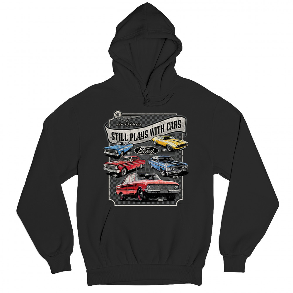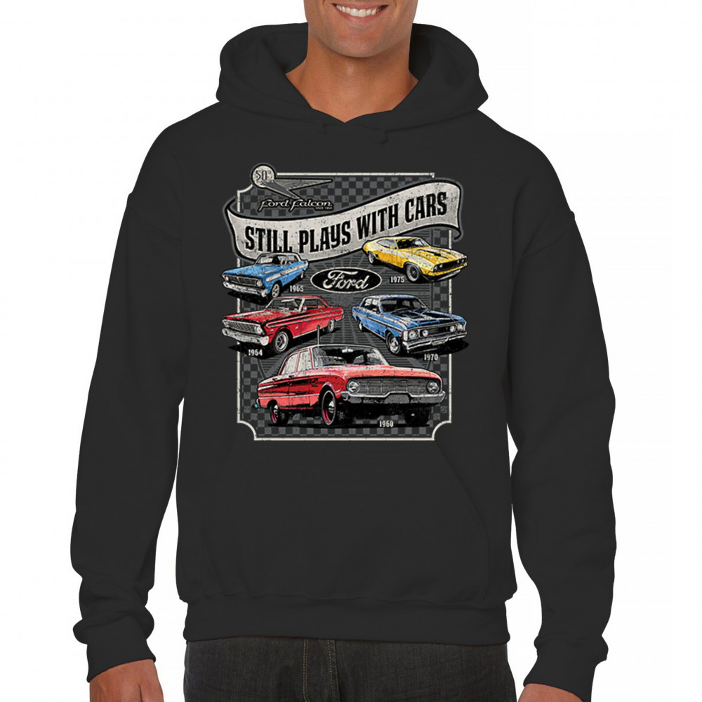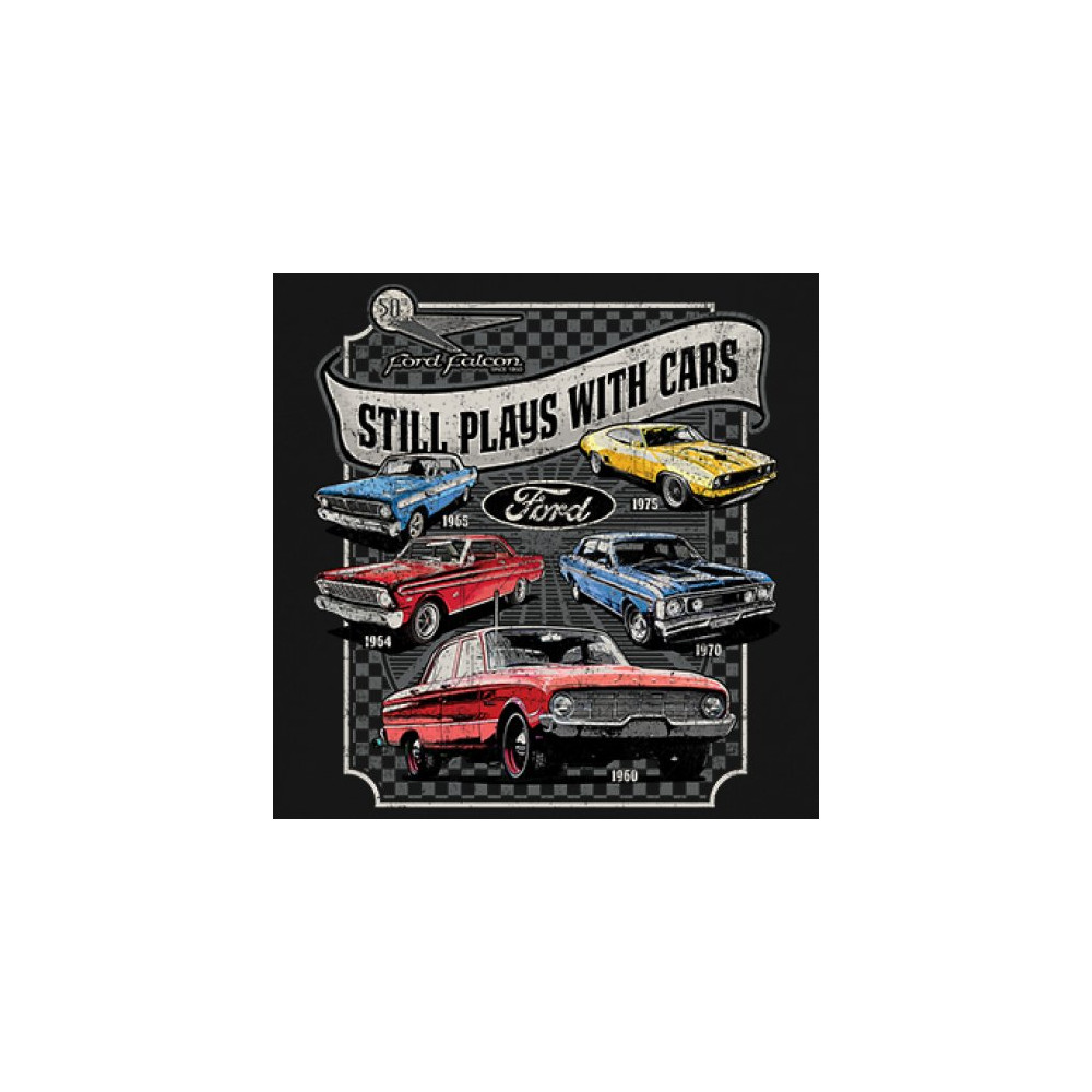 Still Plays With Cars pays tribute to the Ford Falcon, showcasing legendary models from the 60s and 70s for true vintage car lovers. Perfect for gearheads, hot rod fans, and classic car collectors, this design celebrates retro automobile culture, vintage horsepower, and old school rides. A great value piece for anyone devoted to the classic car scene.