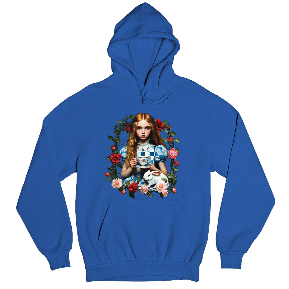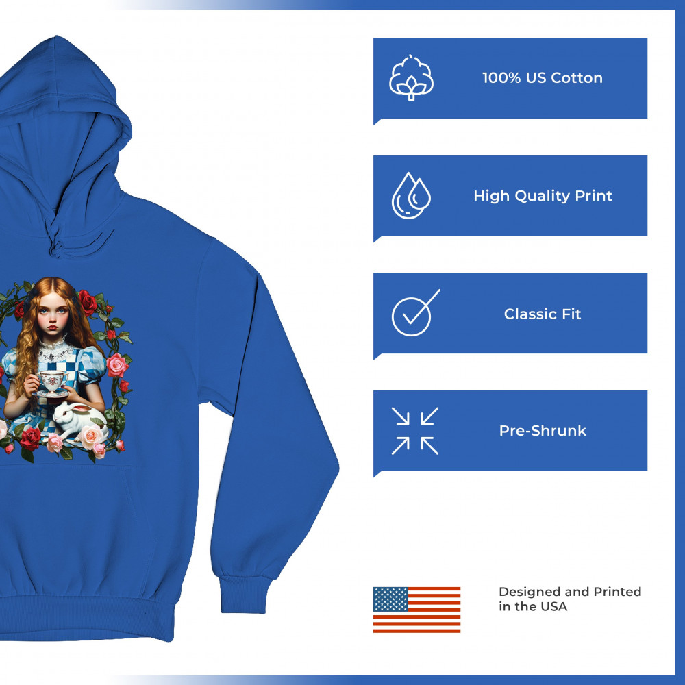 Step into a storybook dream with this Wonderland-inspired design featuring a young girl at a tea party with her white rabbit companion. Framed by roses, it evokes vintage charm, fantasy, and magical nostalgia. Ideal for bookworms, collectors, and lovers of fairytales, it blends whimsical elegance with timeless childhood wonder.