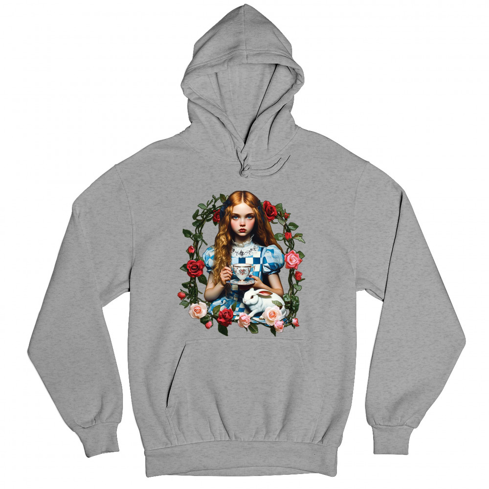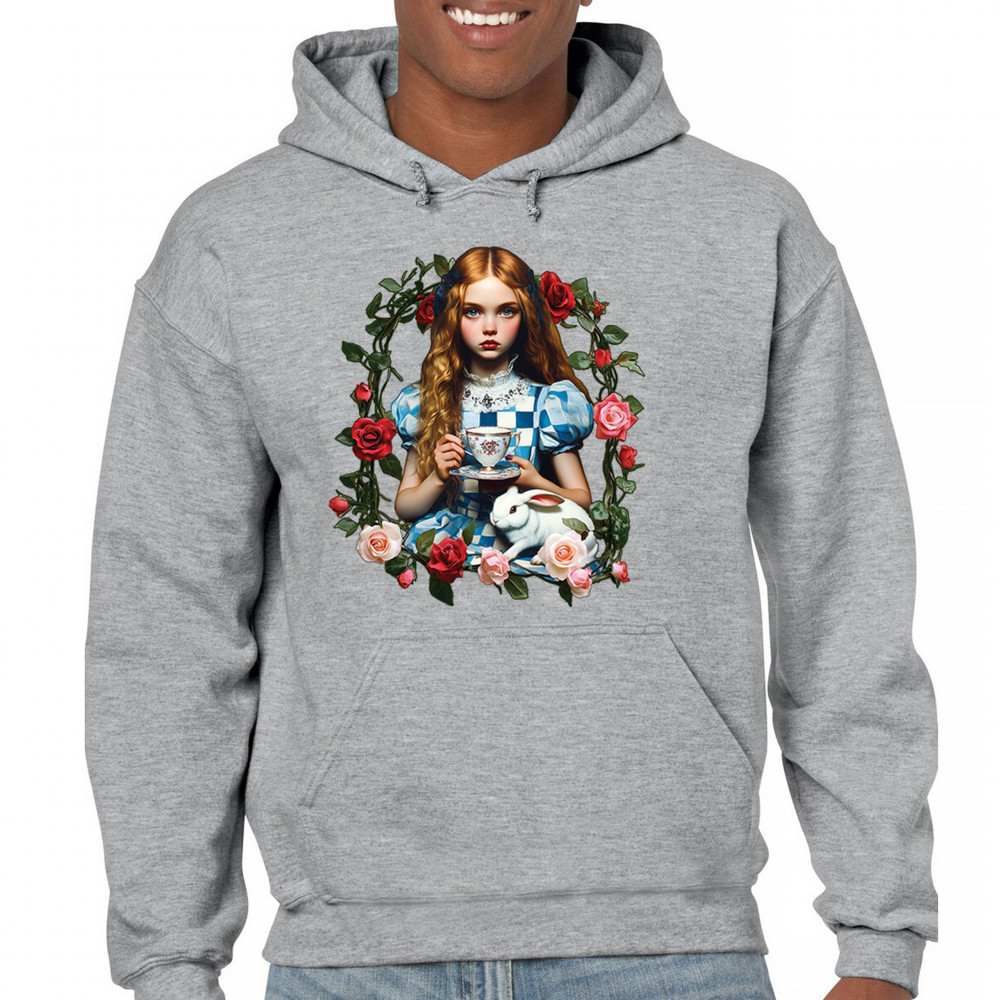 Step into a storybook dream with this Wonderland-inspired design featuring a young girl at a tea party with her white rabbit companion. Framed by roses, it evokes vintage charm, fantasy, and magical nostalgia. Ideal for bookworms, collectors, and lovers of fairytales, it blends whimsical elegance with timeless childhood wonder.