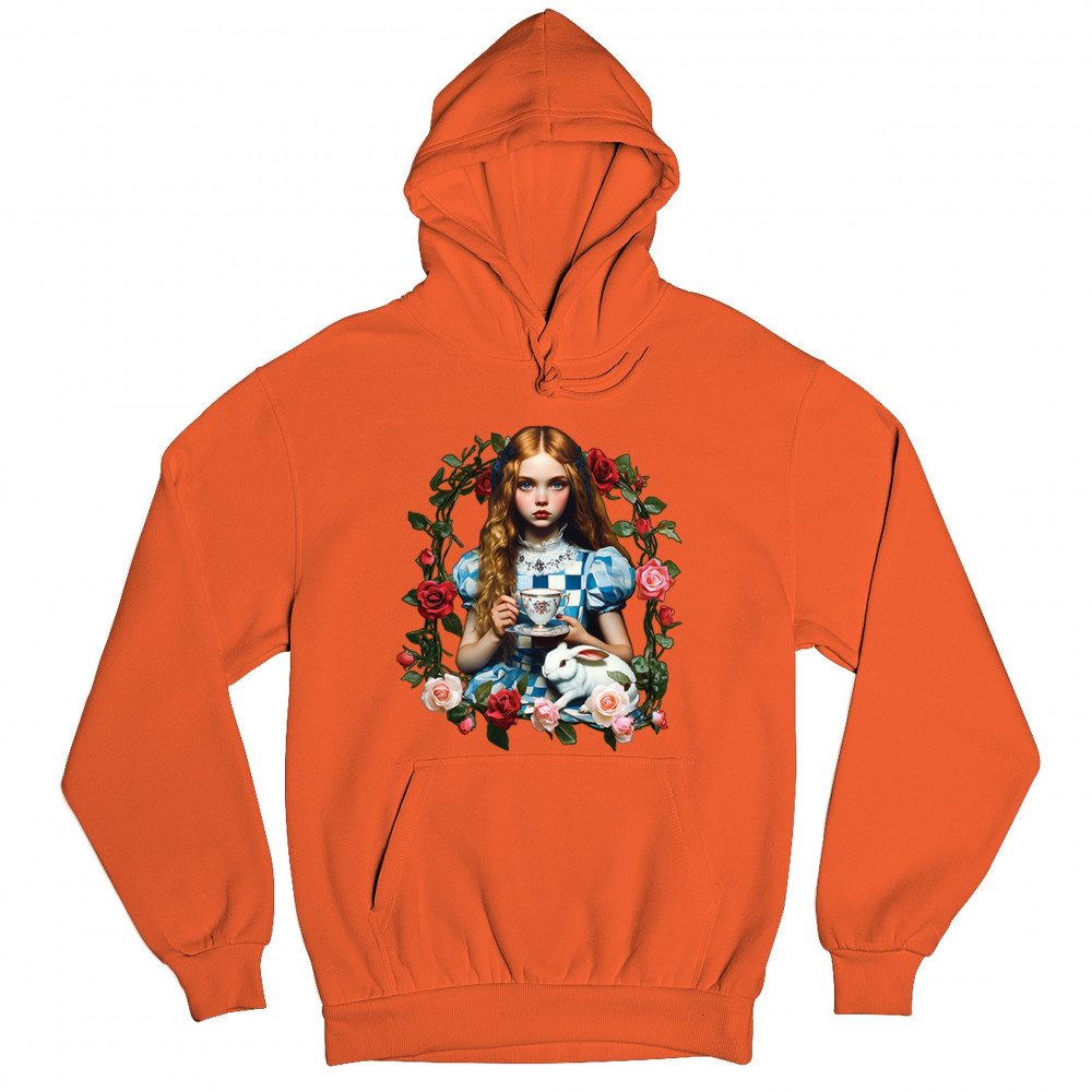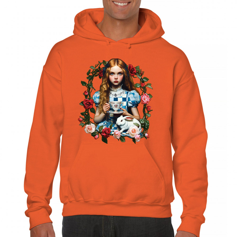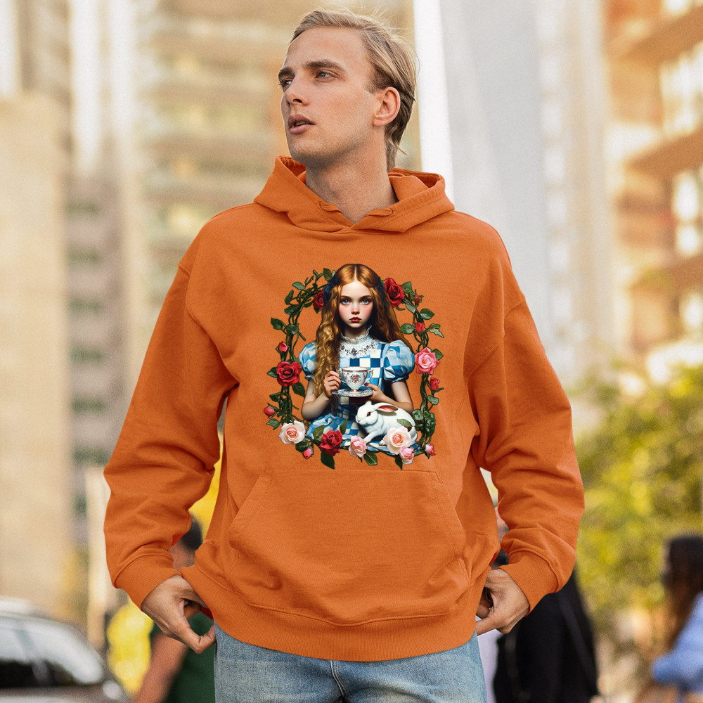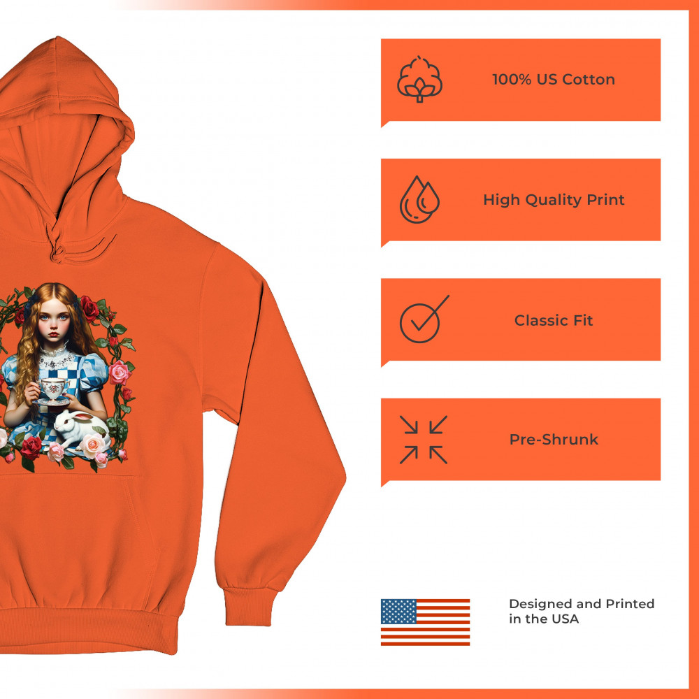 Step into a storybook dream with this Wonderland-inspired design featuring a young girl at a tea party with her white rabbit companion. Framed by roses, it evokes vintage charm, fantasy, and magical nostalgia. Ideal for bookworms, collectors, and lovers of fairytales, it blends whimsical elegance with timeless childhood wonder.