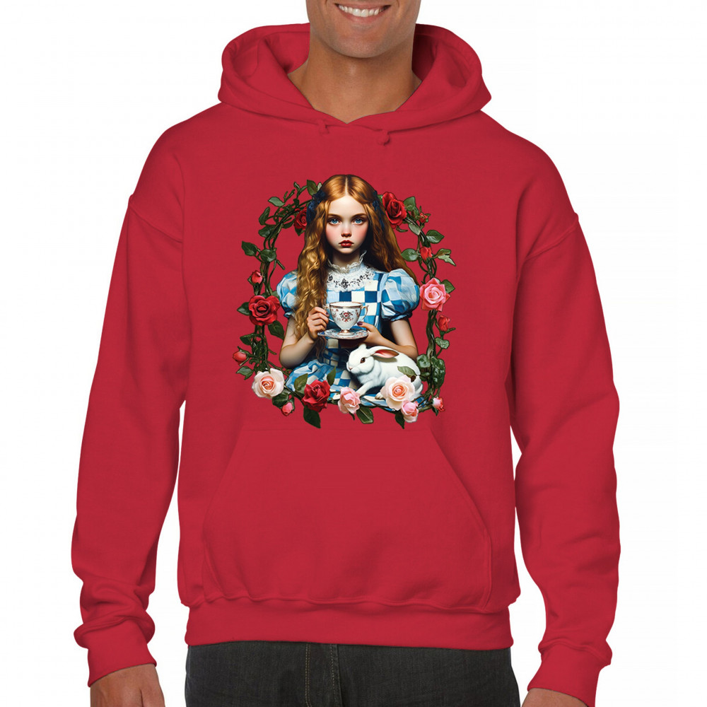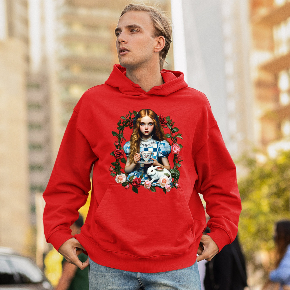 Step into a storybook dream with this Wonderland-inspired design featuring a young girl at a tea party with her white rabbit companion. Framed by roses, it evokes vintage charm, fantasy, and magical nostalgia. Ideal for bookworms, collectors, and lovers of fairytales, it blends whimsical elegance with timeless childhood wonder.