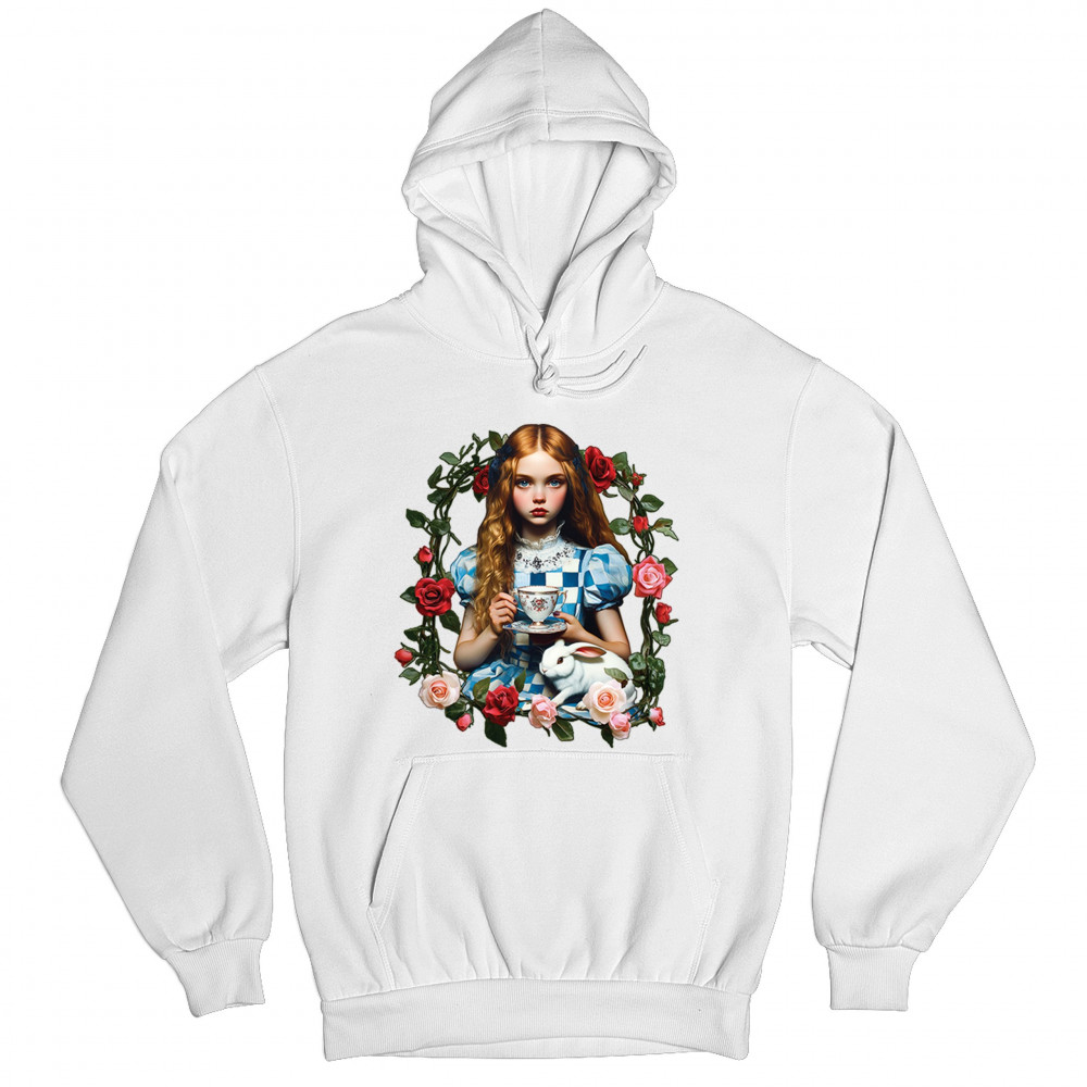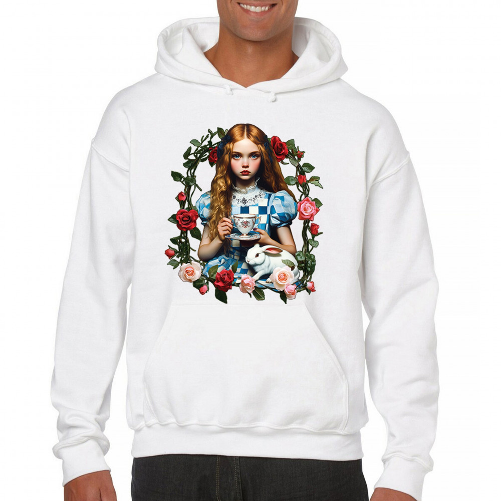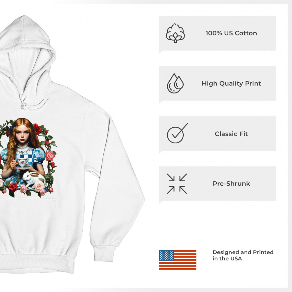 Step into a storybook dream with this Wonderland-inspired design featuring a young girl at a tea party with her white rabbit companion. Framed by roses, it evokes vintage charm, fantasy, and magical nostalgia. Ideal for bookworms, collectors, and lovers of fairytales, it blends whimsical elegance with timeless childhood wonder.