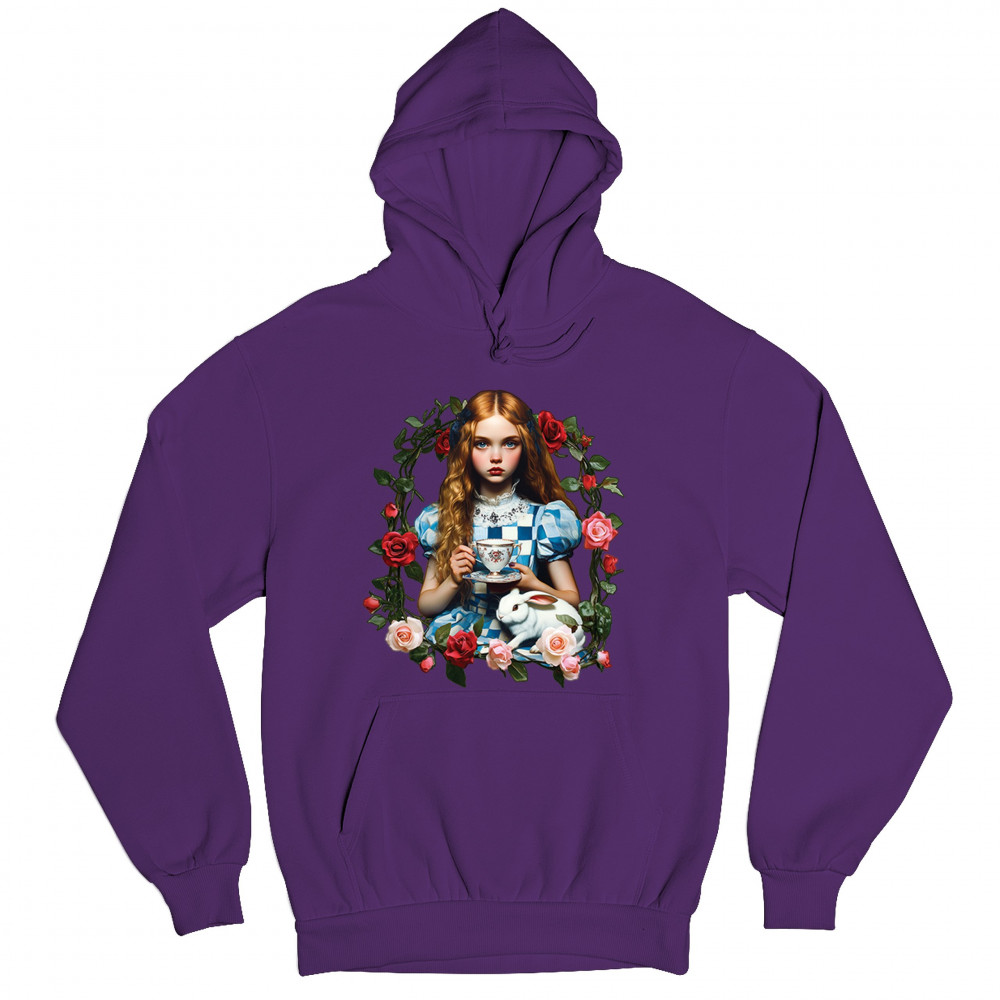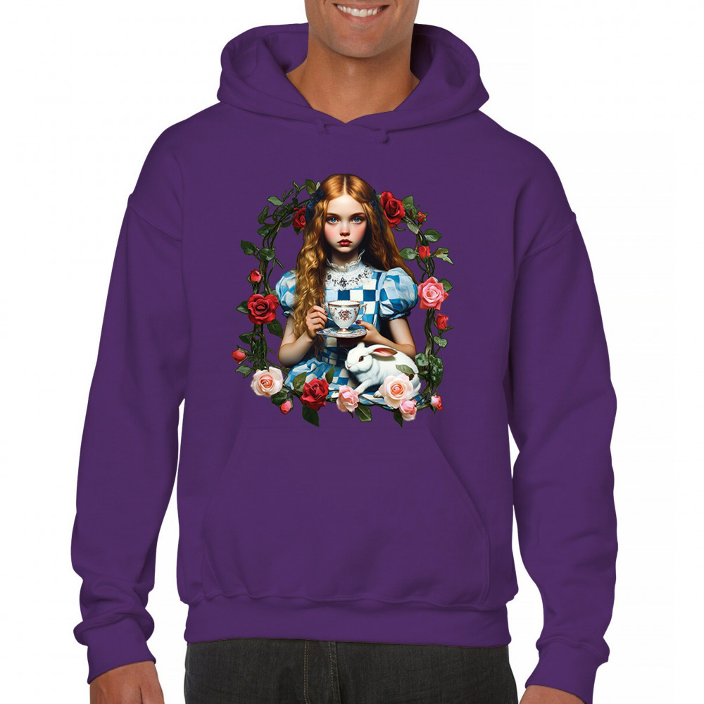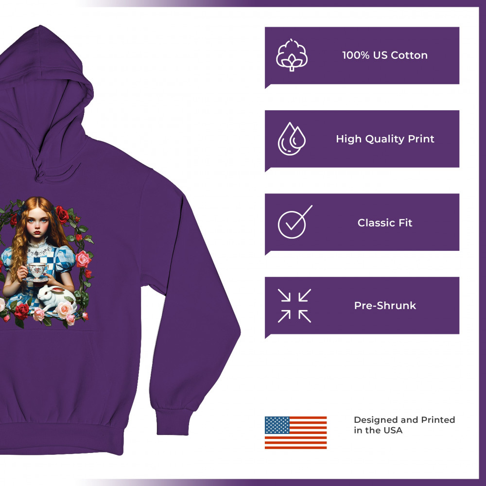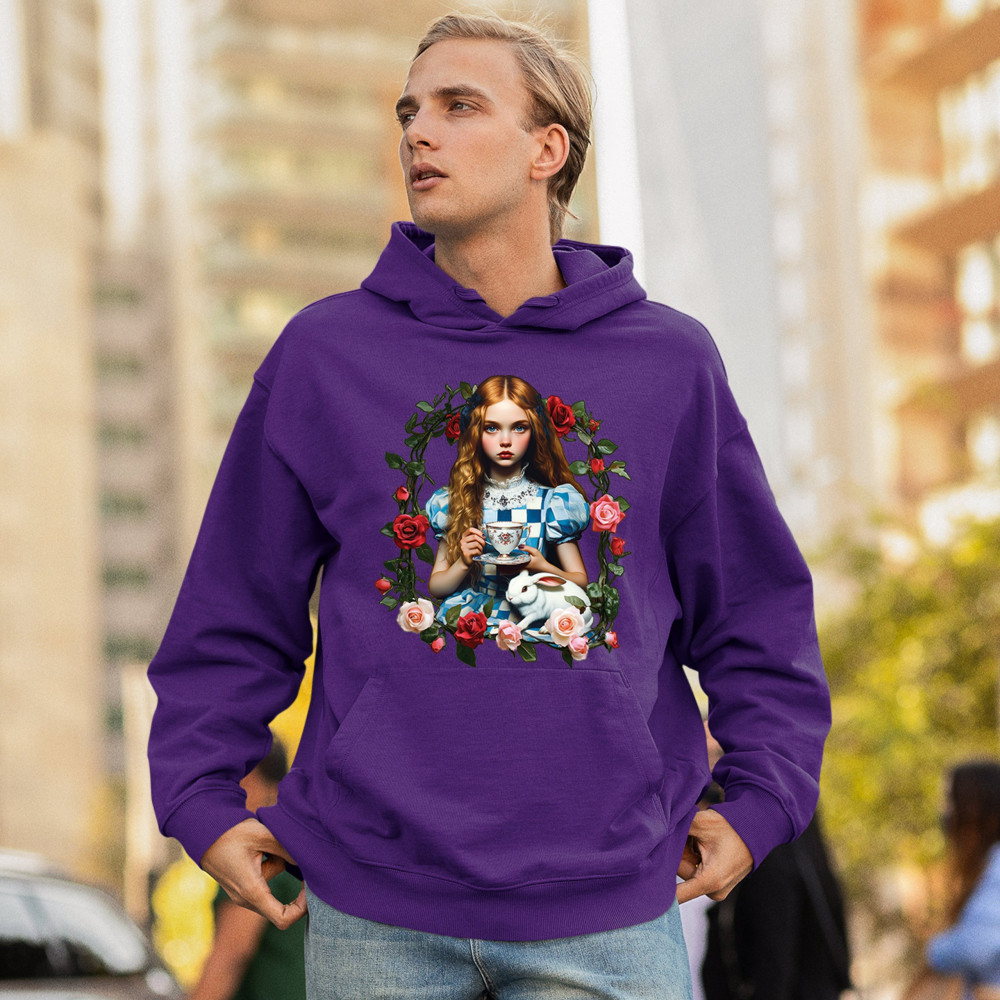 Step into a storybook dream with this Wonderland-inspired design featuring a young girl at a tea party with her white rabbit companion. Framed by roses, it evokes vintage charm, fantasy, and magical nostalgia. Ideal for bookworms, collectors, and lovers of fairytales, it blends whimsical elegance with timeless childhood wonder.