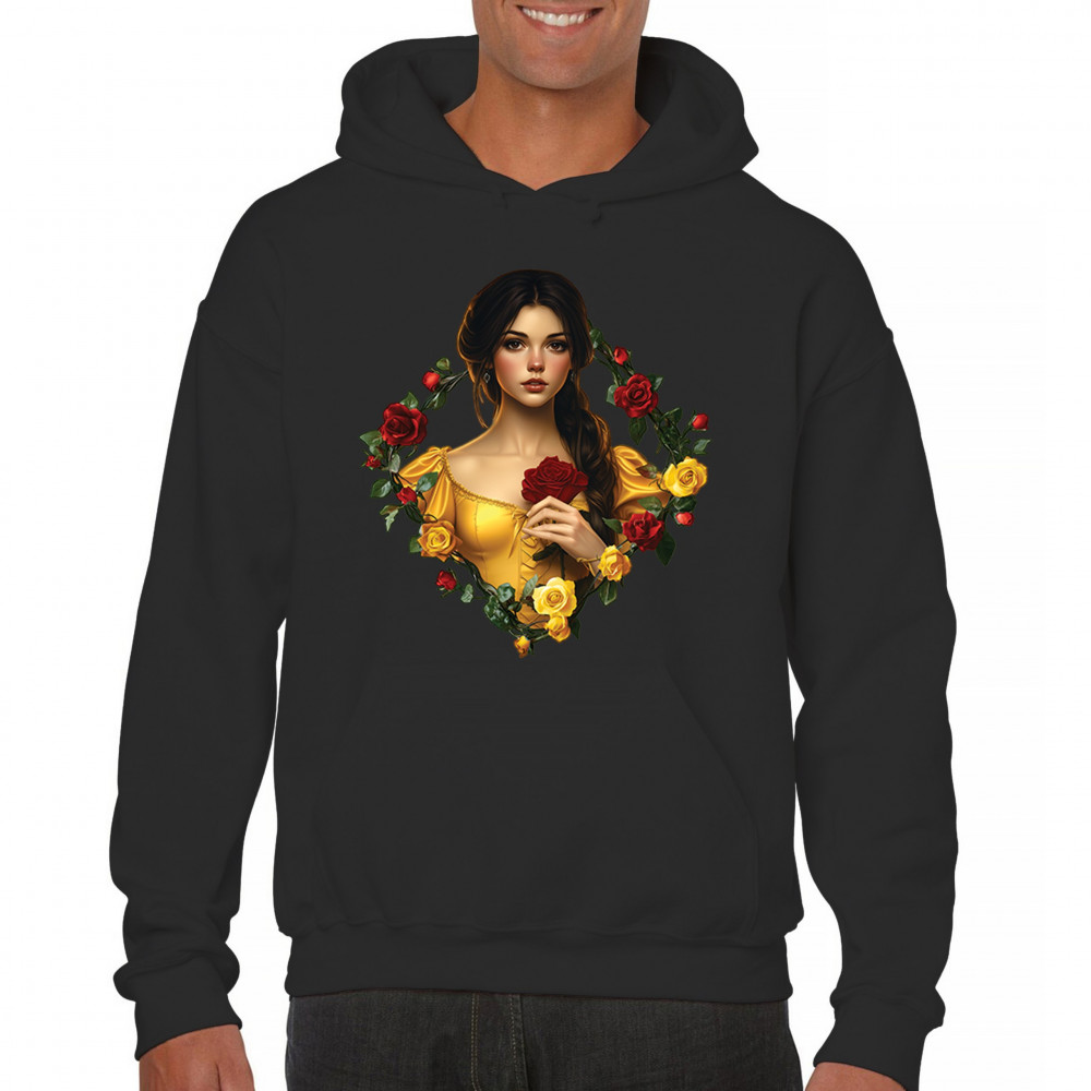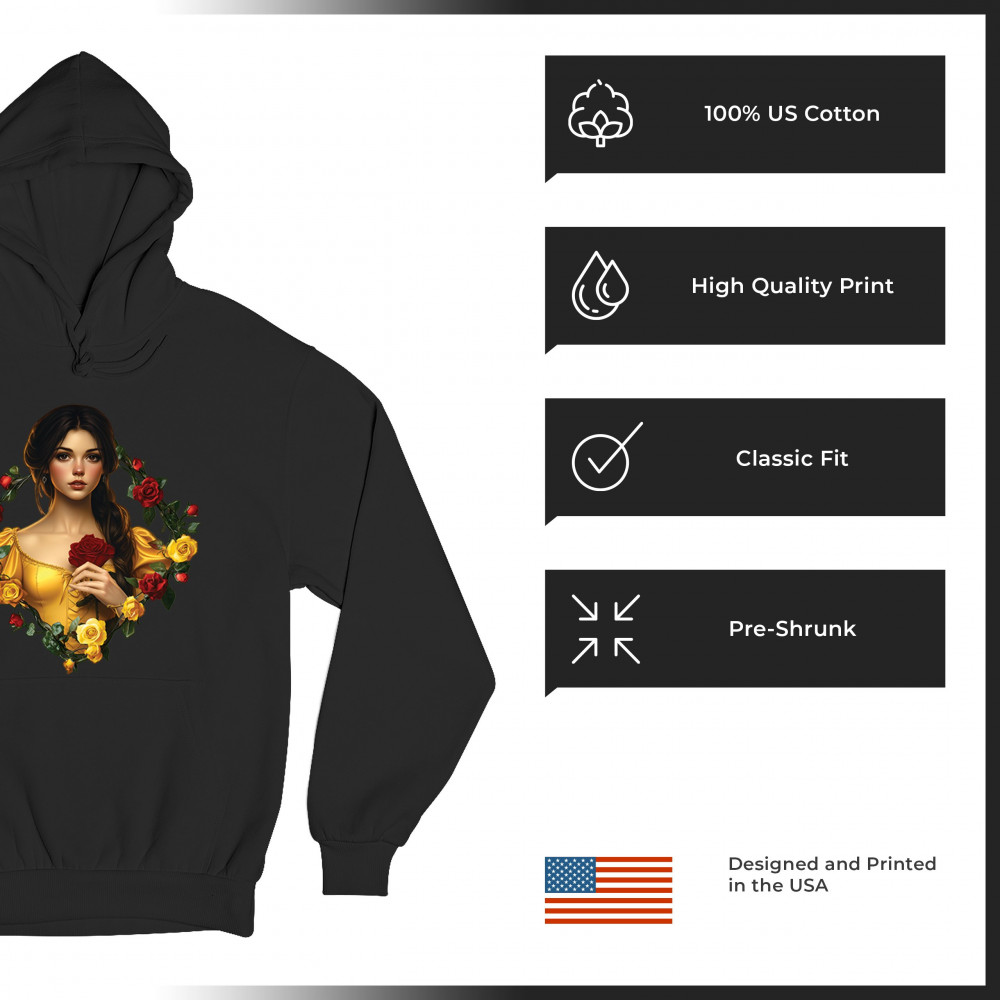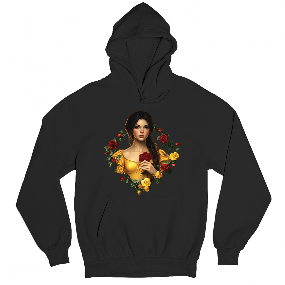 Inspired by classic fairytales, this design features a girl in a yellow gown holding a red rose, framed by rich red and yellow roses. A tribute to Beauty and the Beast, it radiates warmth, romance, and timeless fantasy. Perfect for storybook lovers, enchanted art collectors, or those drawn to magical, symbolic imagery filled with beauty and grace.
