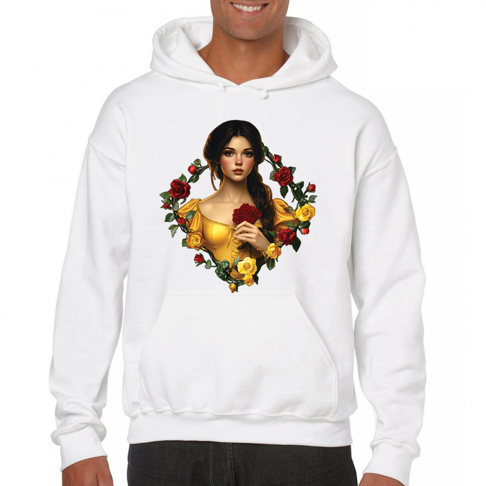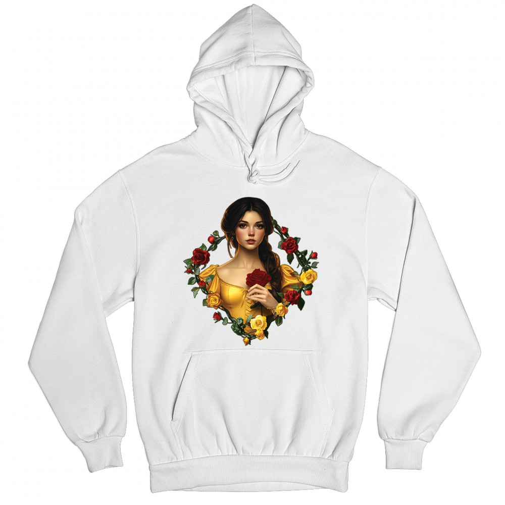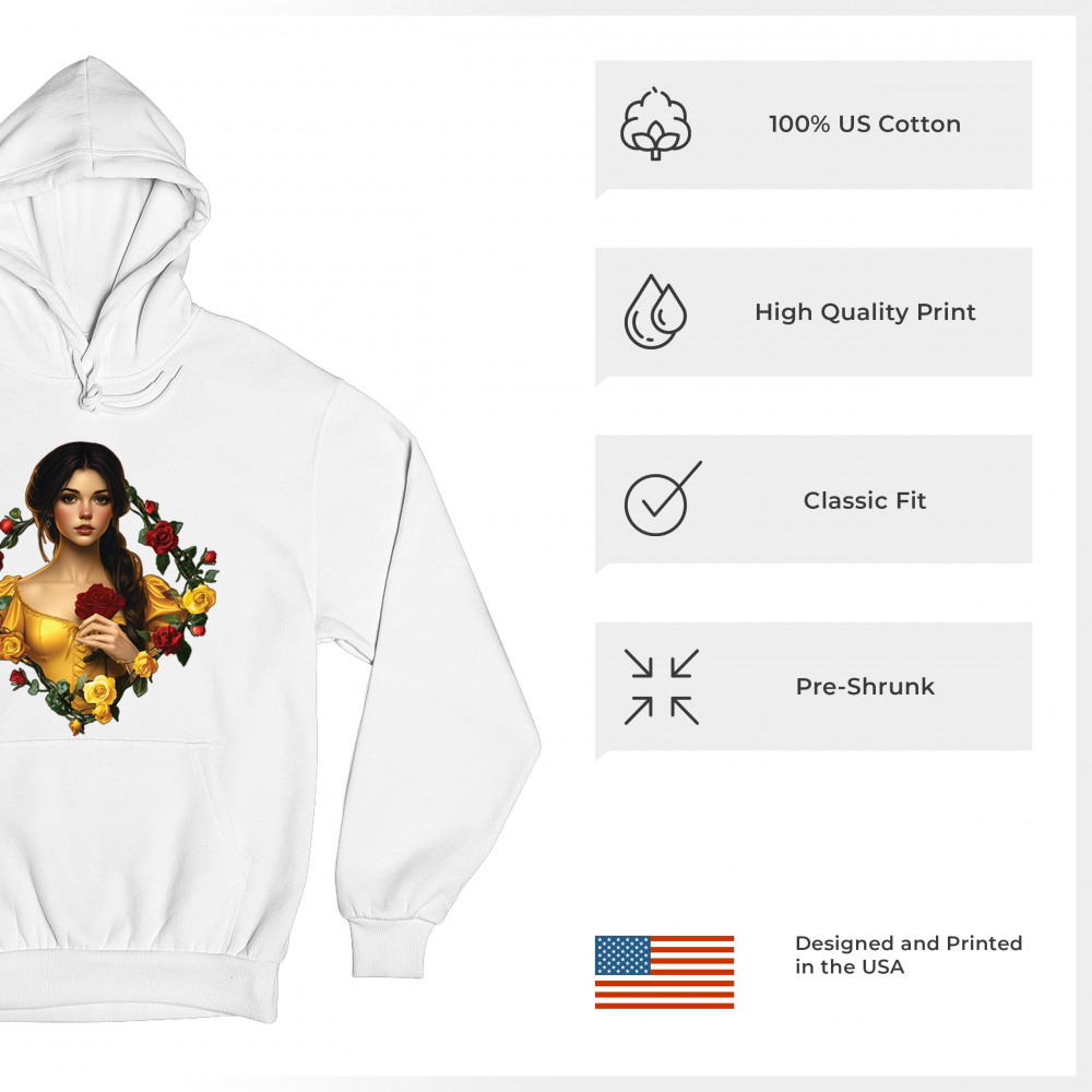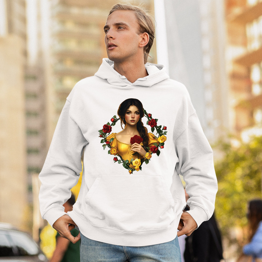 Inspired by classic fairytales, this design features a girl in a yellow gown holding a red rose, framed by rich red and yellow roses. A tribute to Beauty and the Beast, it radiates warmth, romance, and timeless fantasy. Perfect for storybook lovers, enchanted art collectors, or those drawn to magical, symbolic imagery filled with beauty and grace.