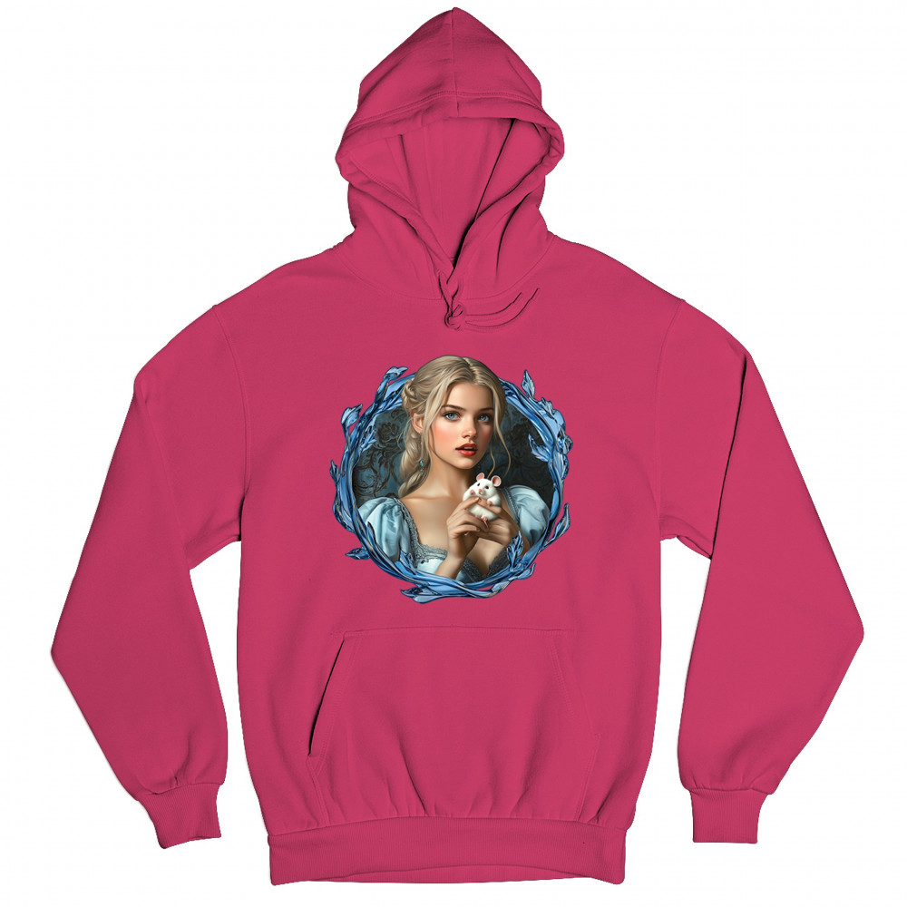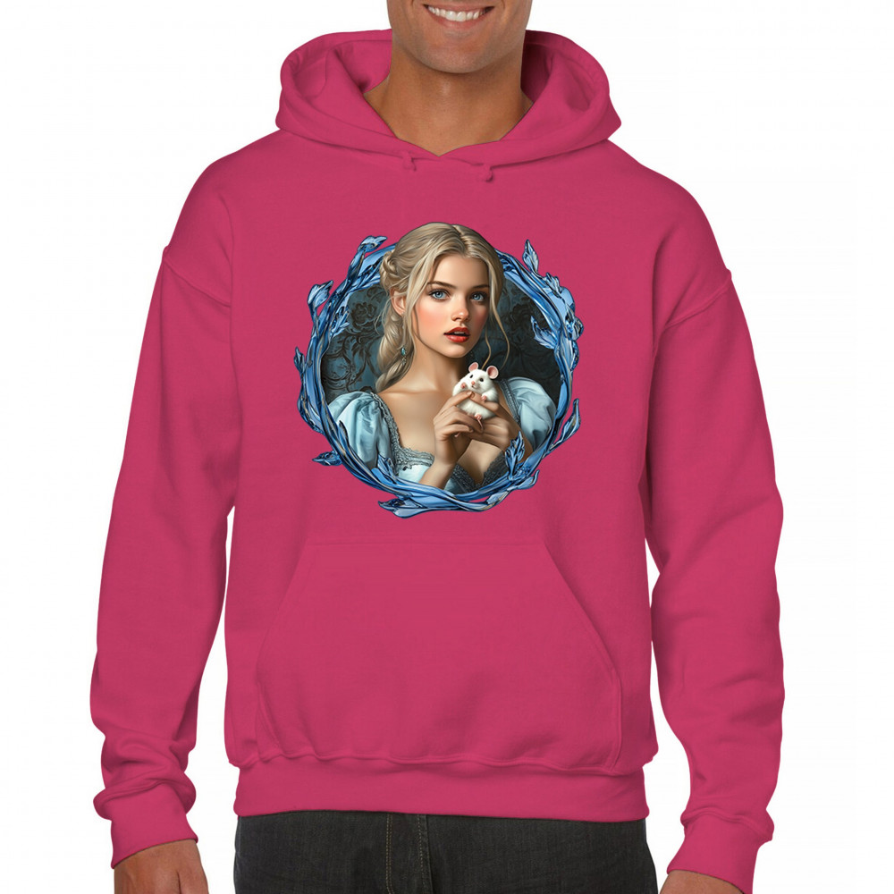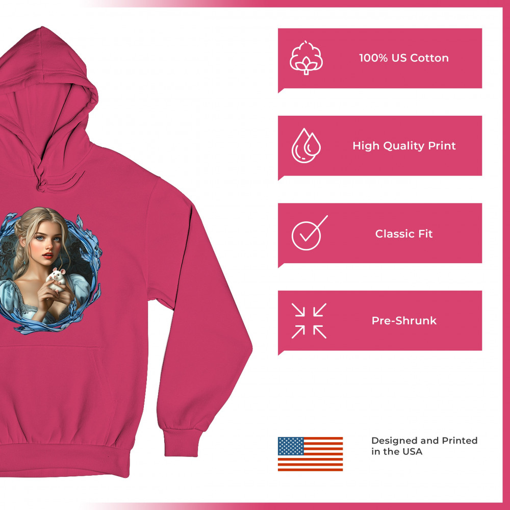 Fairytale design of blonde girl with white mouse in blue leaf frame. Inspired by Cinderella themes of kindness, fantasy, and transformation.