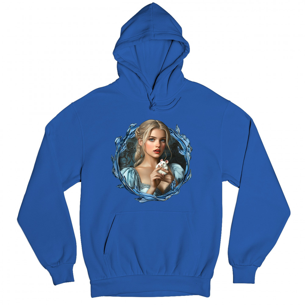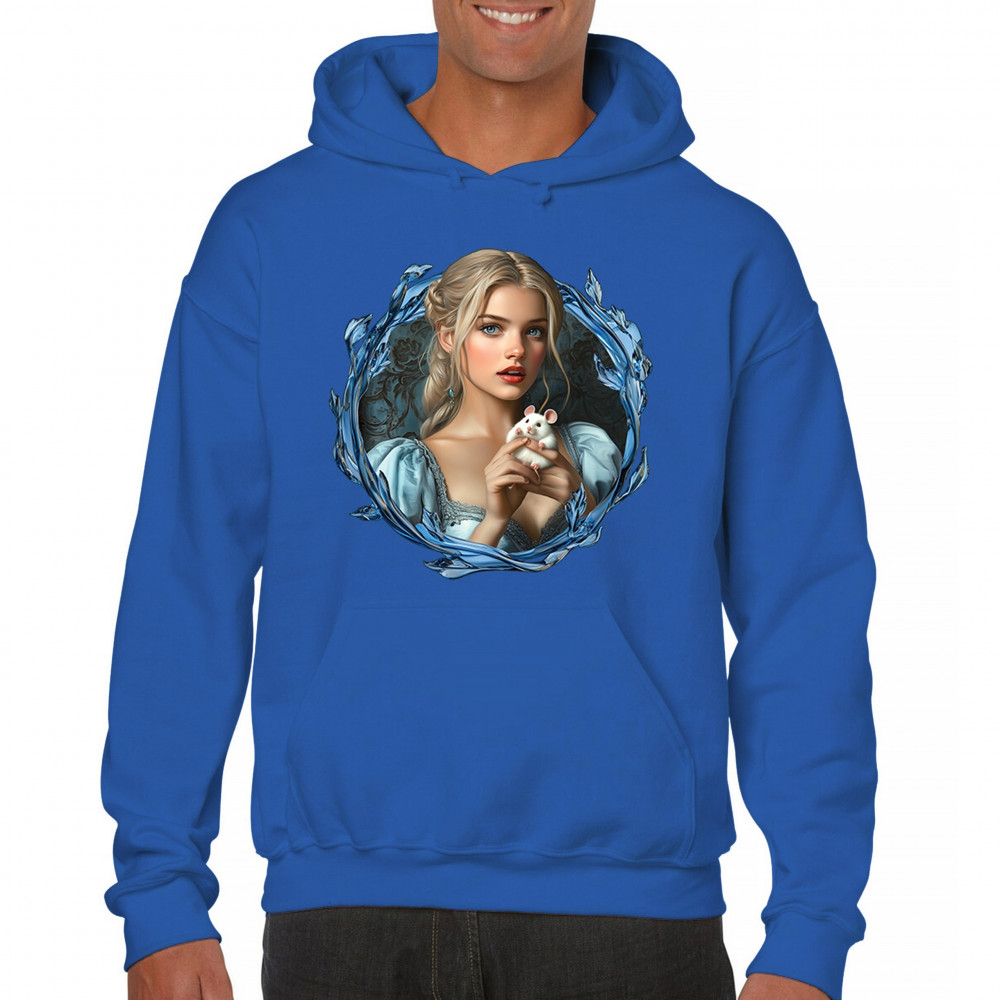 Fairytale design of blonde girl with white mouse in blue leaf frame. Inspired by Cinderella themes of kindness, fantasy, and transformation.