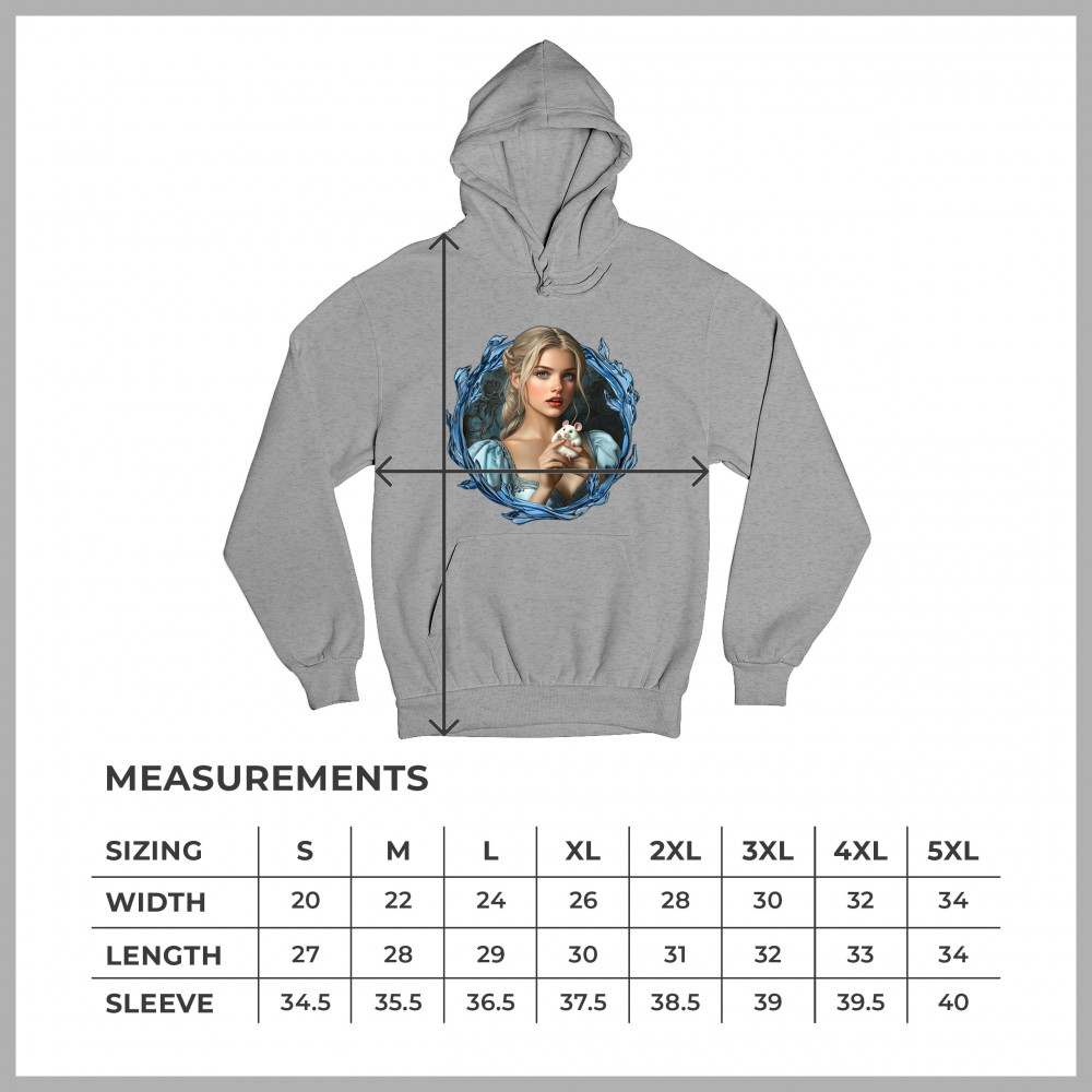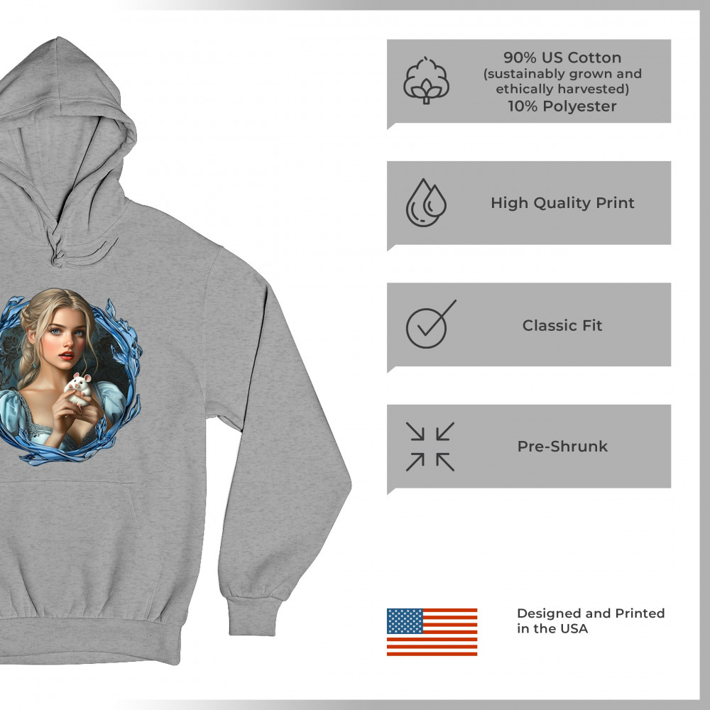 A whimsical design inspired by fairytales and Cinderella magic, featuring a blonde girl in a blue dress holding a white mouse. The icy blue leaf frame evokes enchantment and transformation. With soft, vintage tones and a dreamy feel, it’s a charming tribute to kindness, fantasy, animal companionship, and gentle storytelling magic.