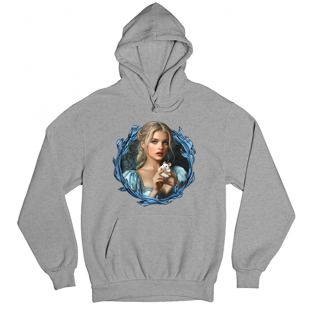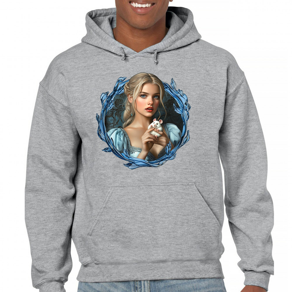 Fairytale design of blonde girl with white mouse in blue leaf frame. Inspired by Cinderella themes of kindness, fantasy, and transformation.