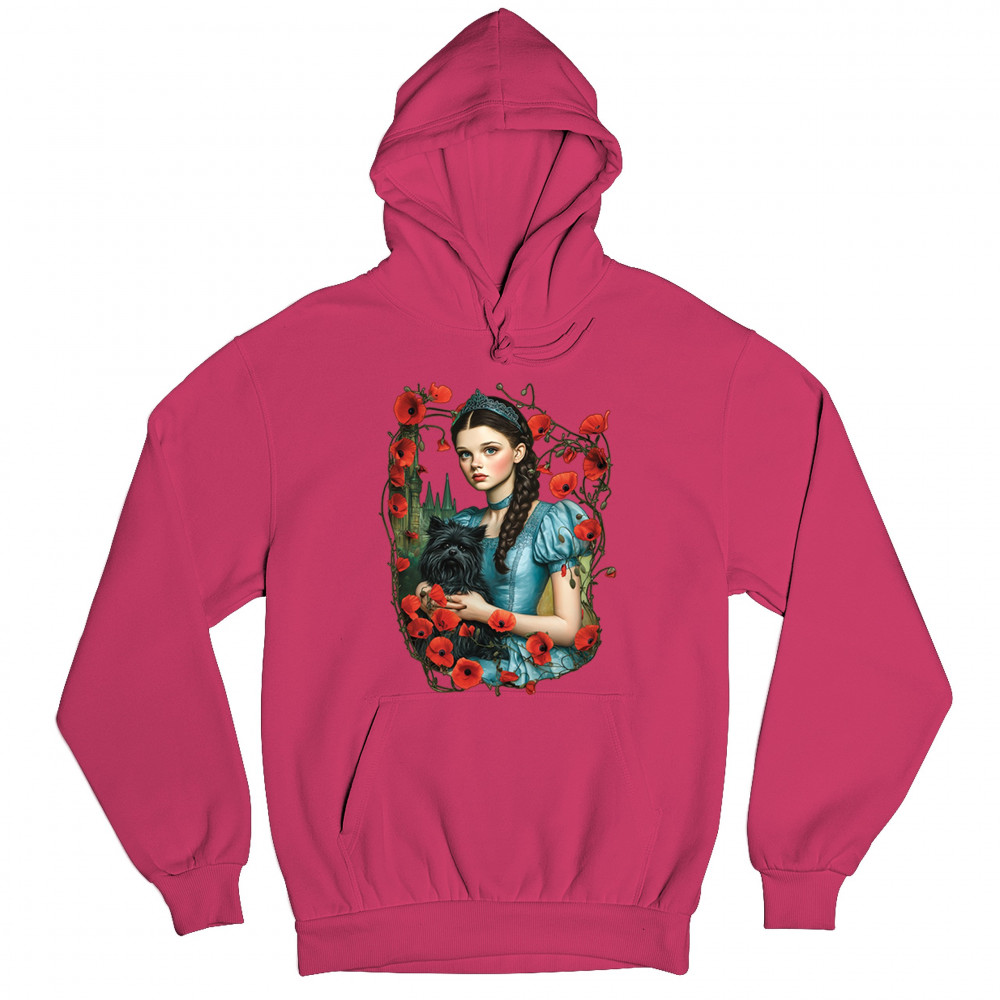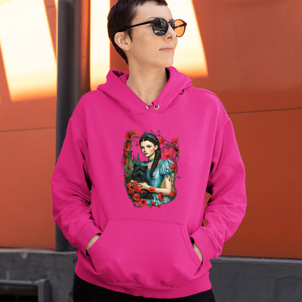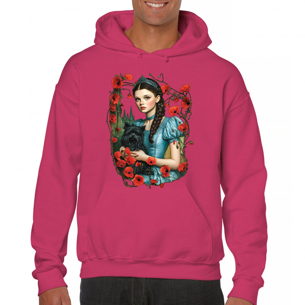 A charming design inspired by dark fairytales, featuring a girl in a blue dress holding her black dog amidst blooming red poppies. A distant castle and vintage styling channel Wizard of Oz fantasy with a gothic twist. Ideal for dreamers, nostalgic collectors, and lovers of whimsical storybook art filled with magic and memory.