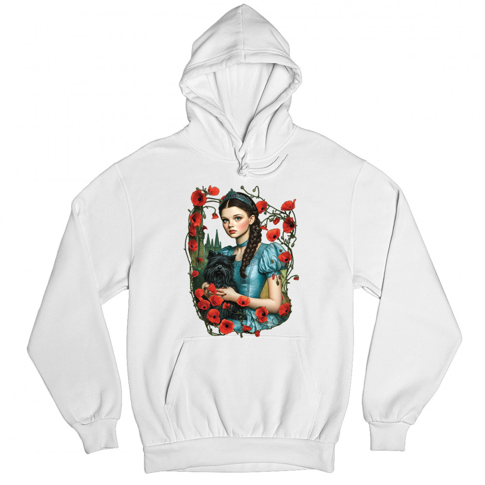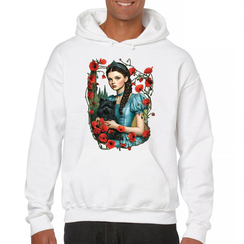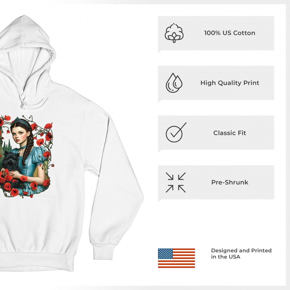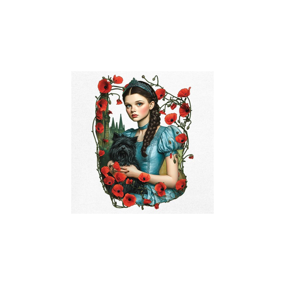 A charming design inspired by dark fairytales, featuring a girl in a blue dress holding her black dog amidst blooming red poppies. A distant castle and vintage styling channel Wizard of Oz fantasy with a gothic twist. Ideal for dreamers, nostalgic collectors, and lovers of whimsical storybook art filled with magic and memory.