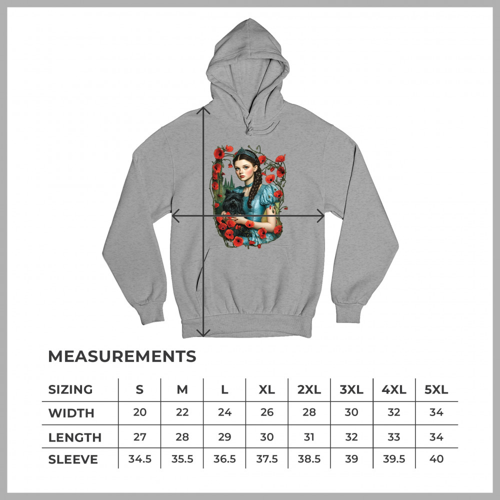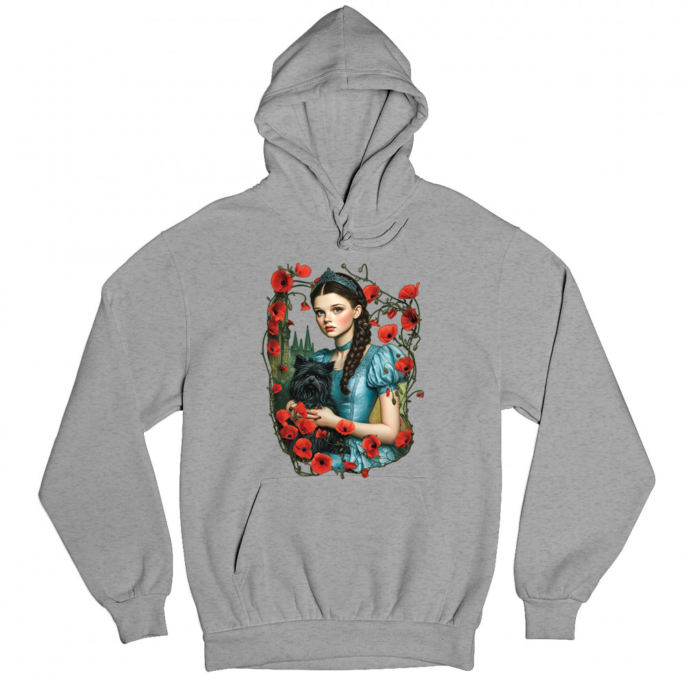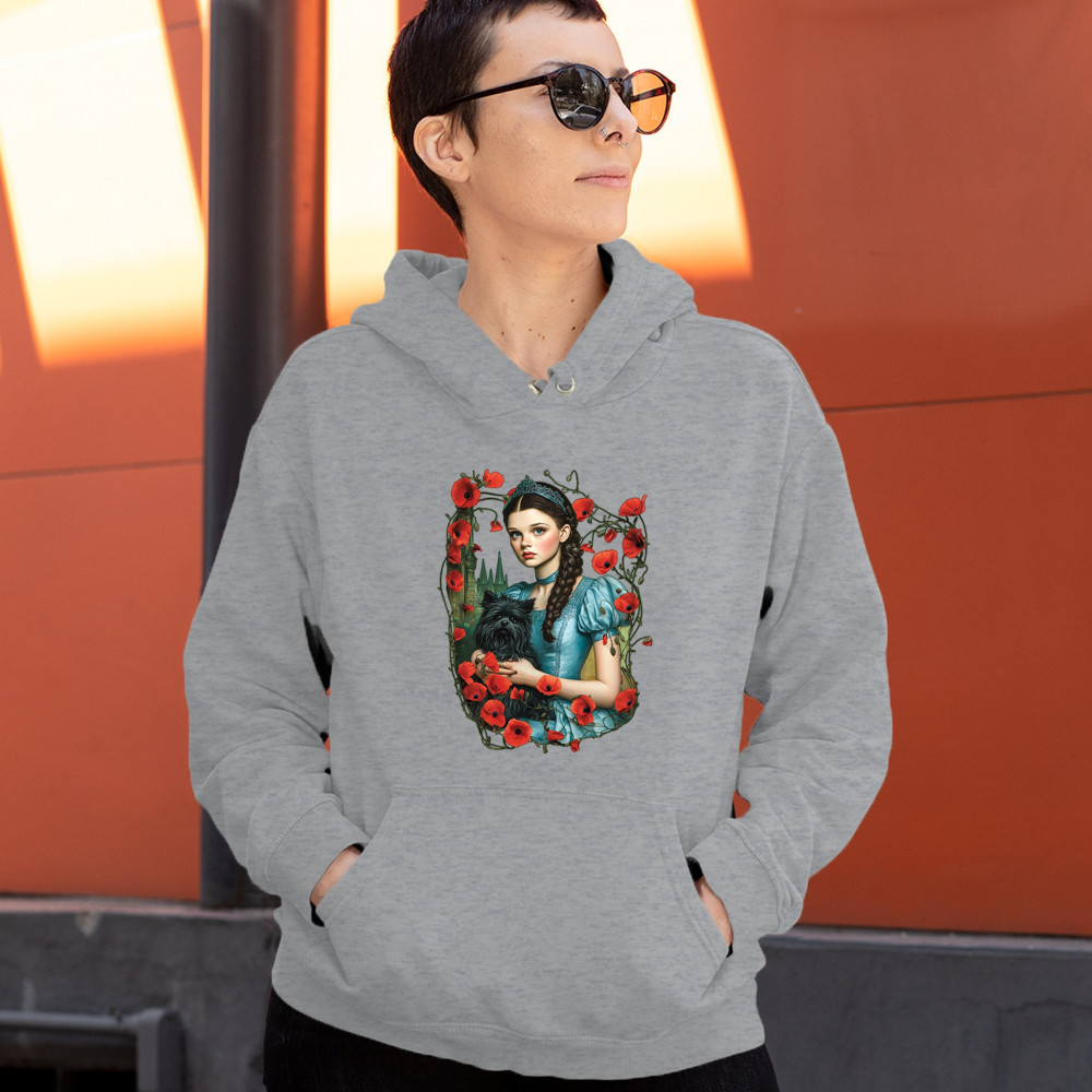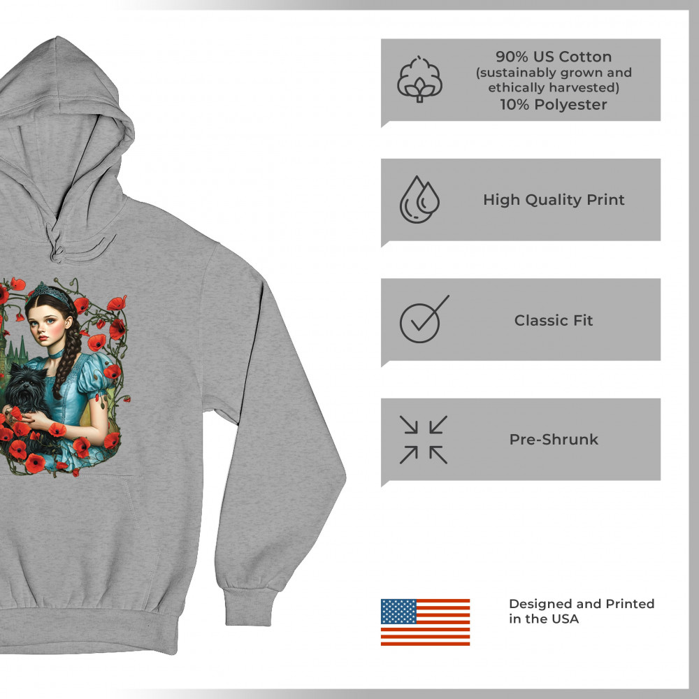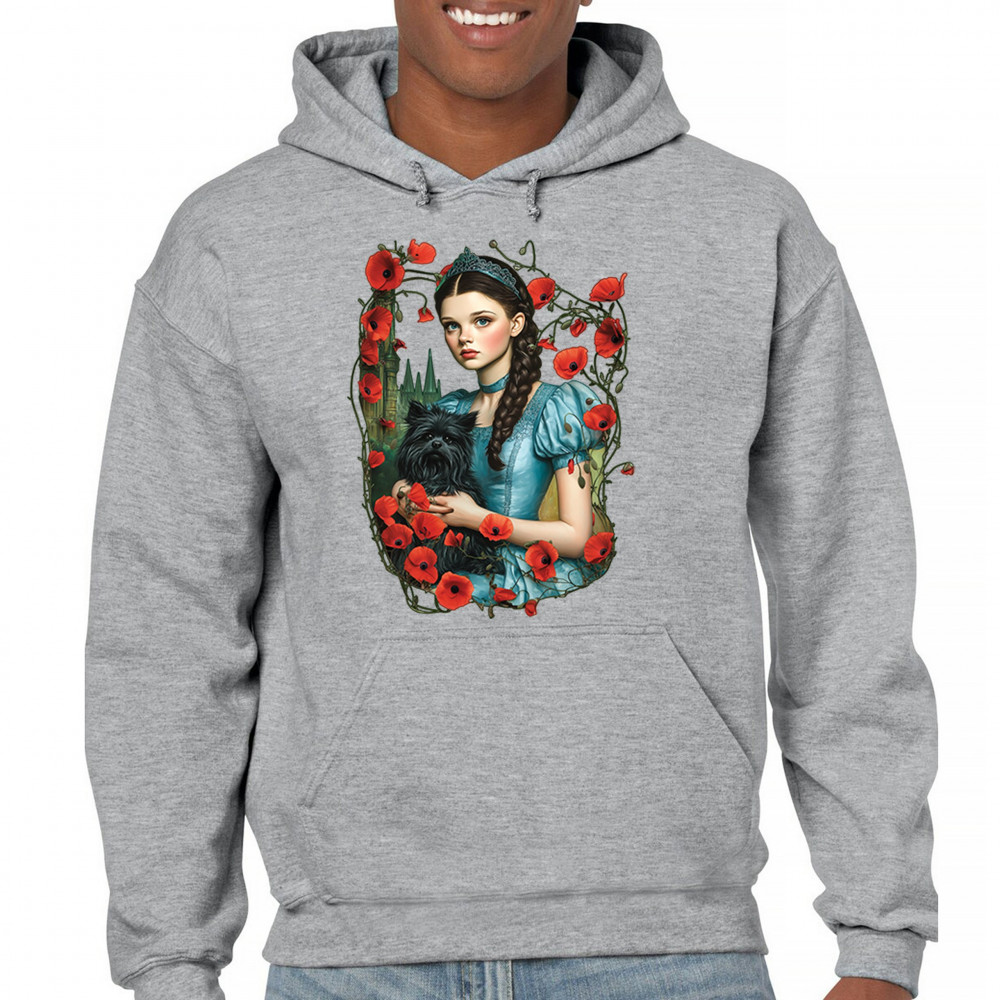 A charming design inspired by dark fairytales, featuring a girl in a blue dress holding her black dog amidst blooming red poppies. A distant castle and vintage styling channel Wizard of Oz fantasy with a gothic twist. Ideal for dreamers, nostalgic collectors, and lovers of whimsical storybook art filled with magic and memory.