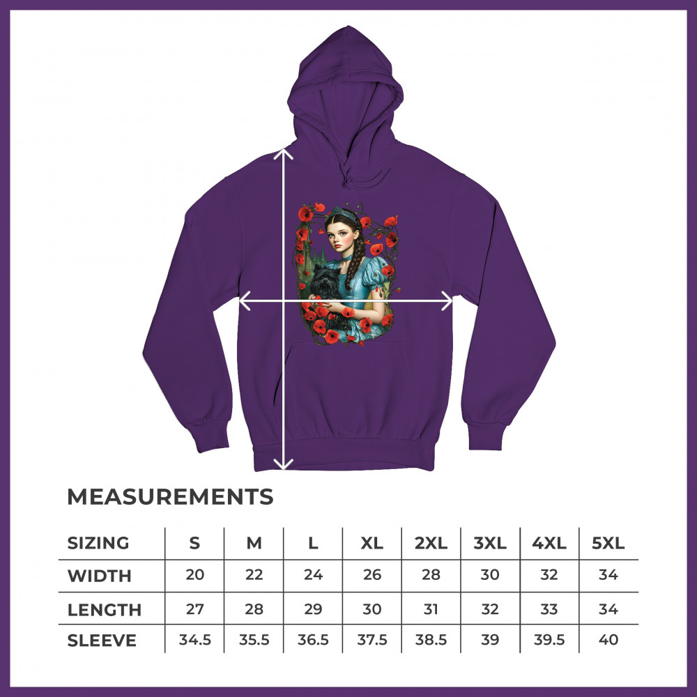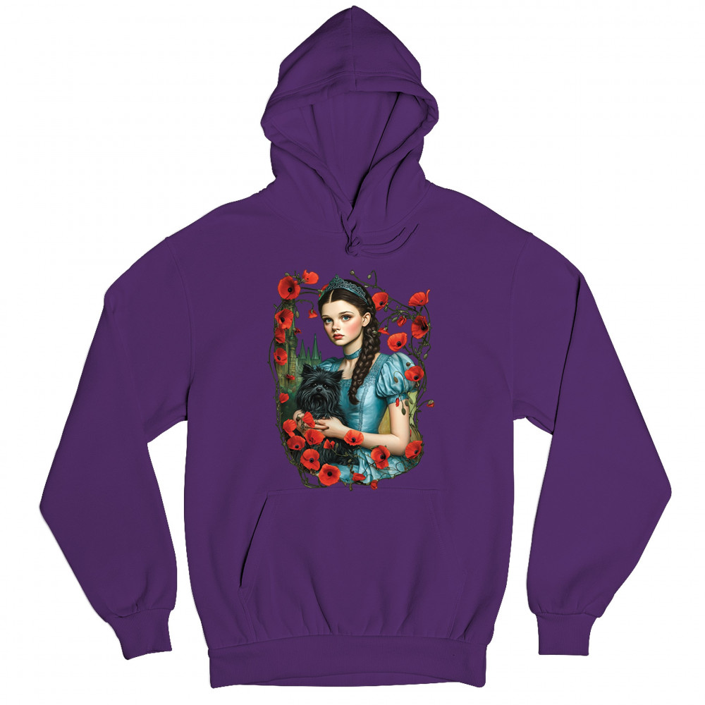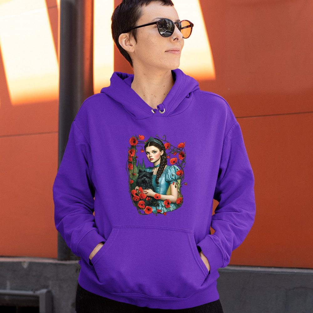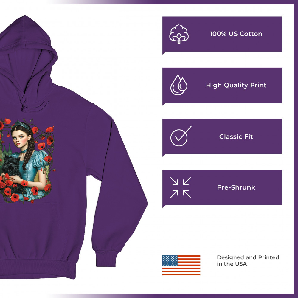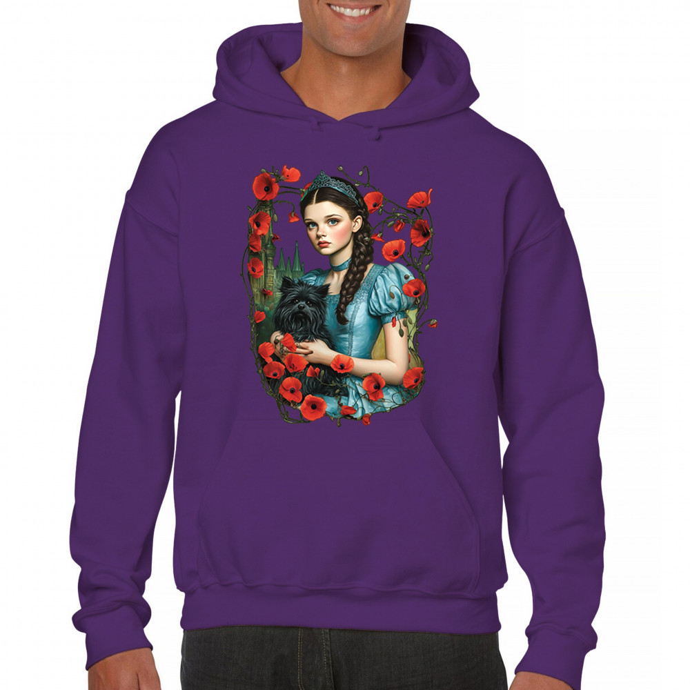 A charming design inspired by dark fairytales, featuring a girl in a blue dress holding her black dog amidst blooming red poppies. A distant castle and vintage styling channel Wizard of Oz fantasy with a gothic twist. Ideal for dreamers, nostalgic collectors, and lovers of whimsical storybook art filled with magic and memory.