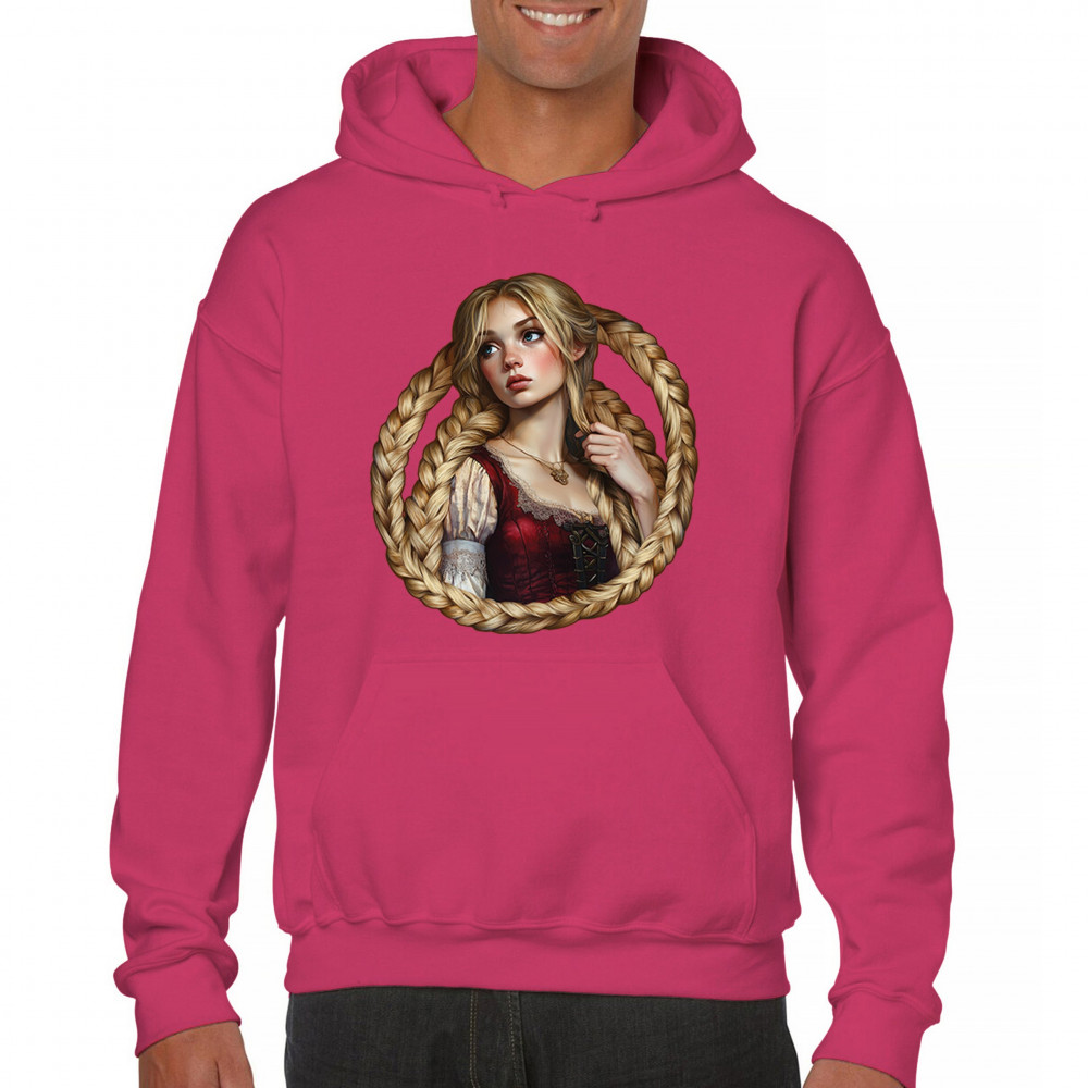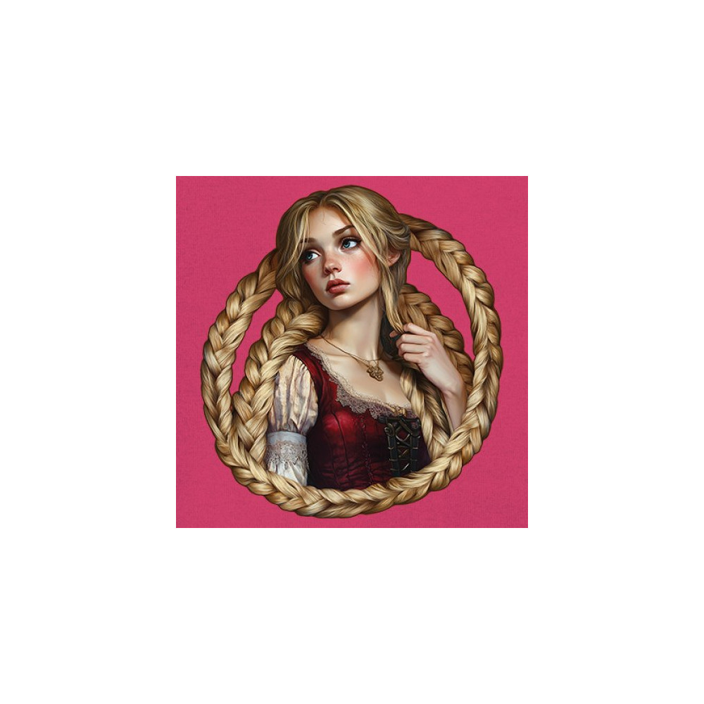 A dreamy design featuring a blonde girl with long braided hair encircling her like a frame. With vintage dress details and a wistful look, this artwork channels the essence of fairytales, romantic legends, and gentle feminine power. Ideal for fantasy lovers, folklore fans, and collectors of magical storybook themes.