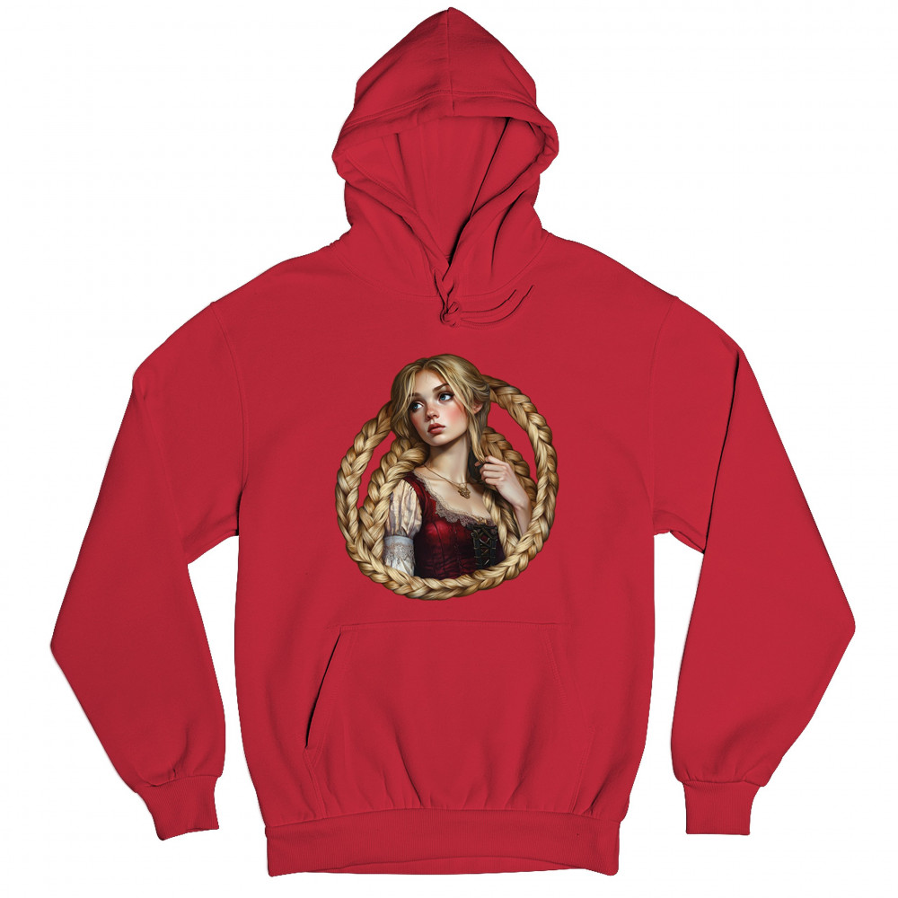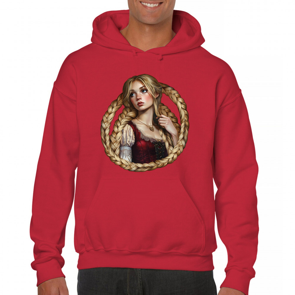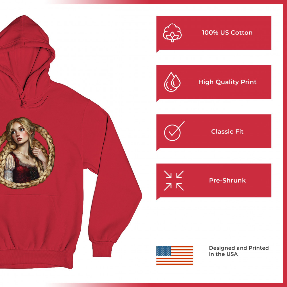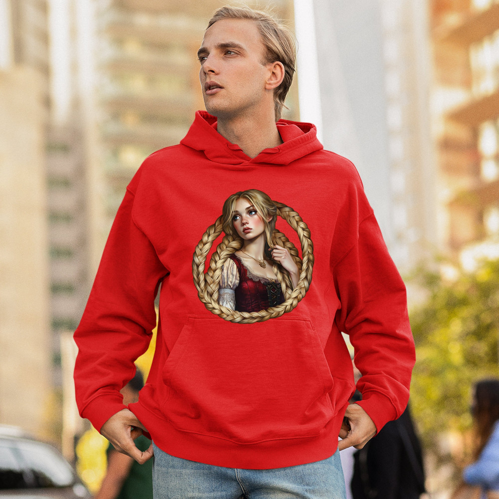 A dreamy design featuring a blonde girl with long braided hair encircling her like a frame. With vintage dress details and a wistful look, this artwork channels the essence of fairytales, romantic legends, and gentle feminine power. Ideal for fantasy lovers, folklore fans, and collectors of magical storybook themes.