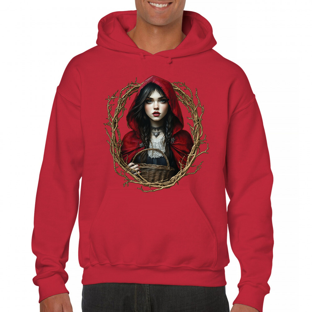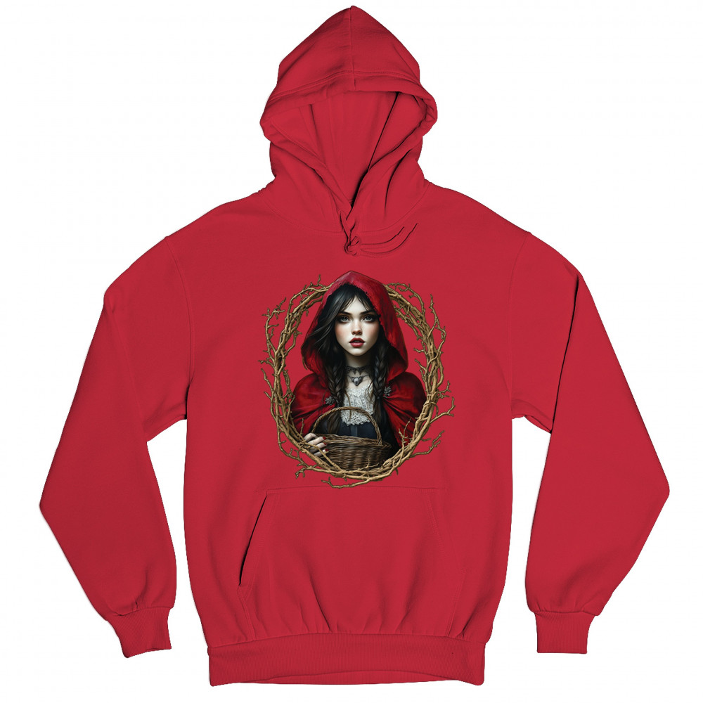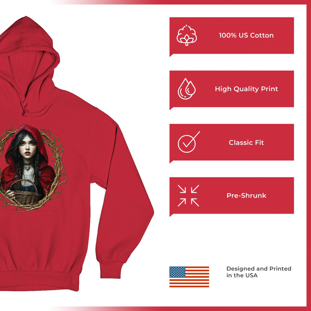 Step into a shadowy fairytale with this gothic design featuring a red-cloaked girl and twisted forest branches. Evoking themes from Red Riding Hood and folklore magic, it’s rich in fantasy, mystery, and dark aesthetic. Perfect for fantasy lovers, dark romantics, and storybook dreamers drawn to enchanted paths and eerie tales.