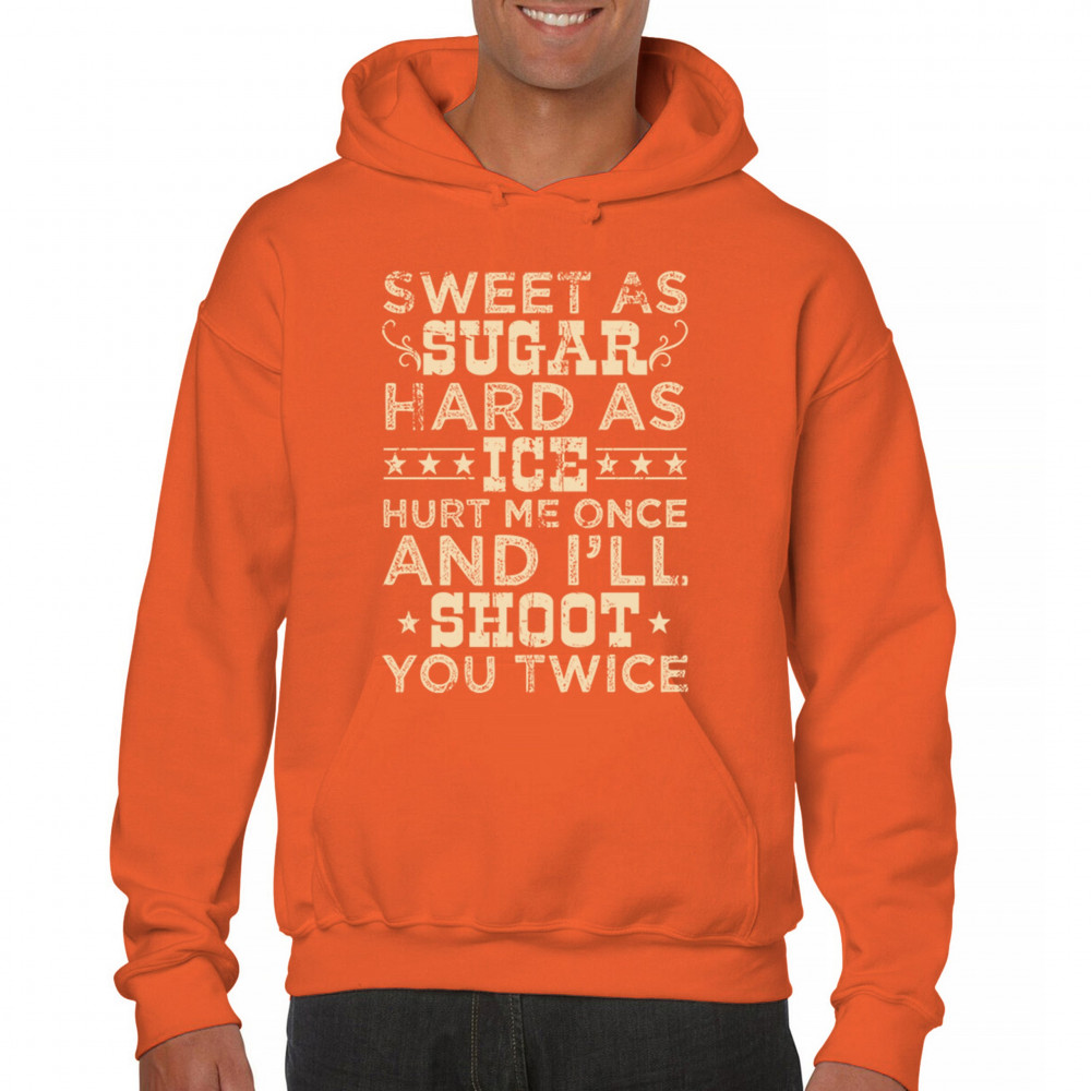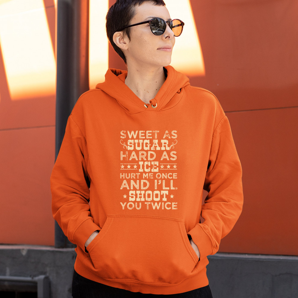 Declare your stance with this bold pro-gun design featuring the quote "Sweet as Sugar, Hard as Ice, Hurt Me Once, I’ll Shoot You Twice." Made for patriots, firearm enthusiasts, military supporters, and defenders of the Constitution. The design blends American pride, 2nd Amendment power, and personal grit in one fierce statement of freedom and justice.