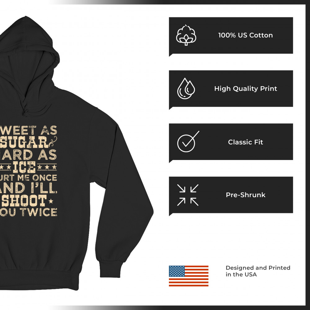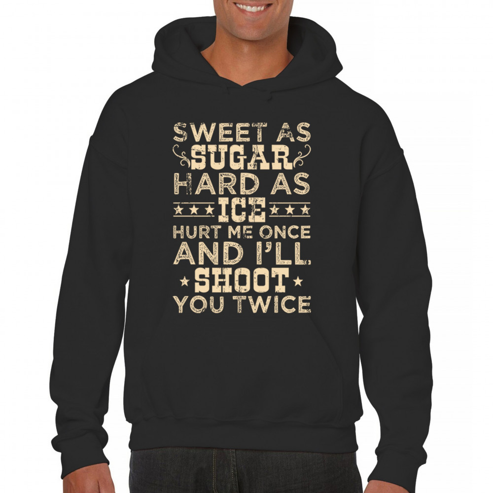 Declare your stance with this bold pro-gun design featuring the quote "Sweet as Sugar, Hard as Ice, Hurt Me Once, I’ll Shoot You Twice." Made for patriots, firearm enthusiasts, military supporters, and defenders of the Constitution. The design blends American pride, 2nd Amendment power, and personal grit in one fierce statement of freedom and justice.