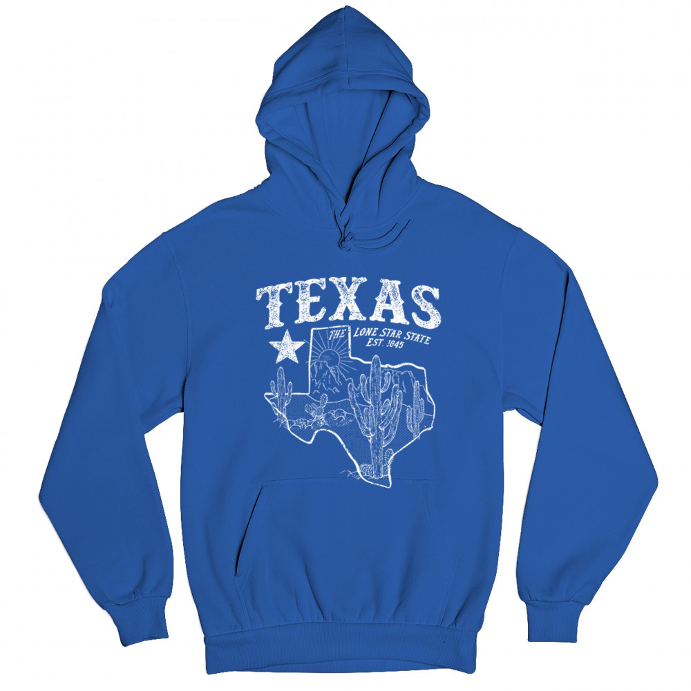 Vintage Texas pride design with cactus, mountains, Lone Star symbol, and 1845 tribute—perfect for rodeos and western events.