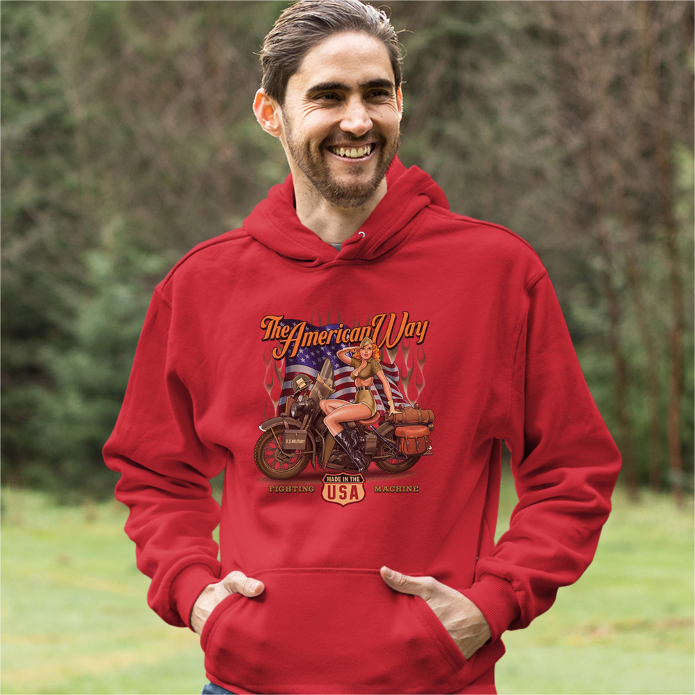 A print featuring a beautiful pin-up girl in leather boots sitting on a U.S. military motorcycle. There is the American Flag in the background and the words "The American Way" above it. At the bottom of the picture there is a shield which says: "made in the USA". "Fighting Machine" is written under the motorcycle's wheels. A great choice for a motorcycle enthusiast.