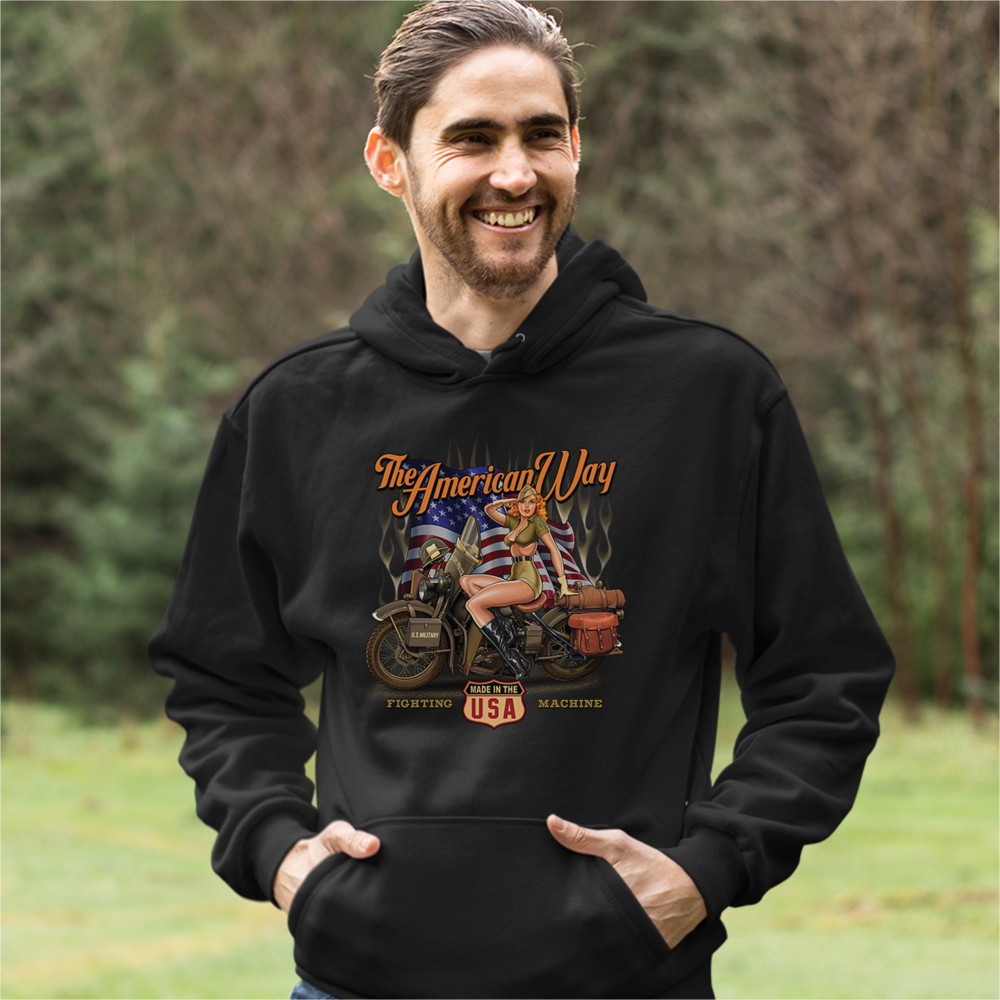 A print featuring a beautiful pin-up girl in leather boots sitting on a U.S. military motorcycle. There is the American Flag in the background and the words "The American Way" above it. At the bottom of the picture there is a shield which says: "made in the USA". "Fighting Machine" is written under the motorcycle's wheels. A great choice for a motorcycle enthusiast.