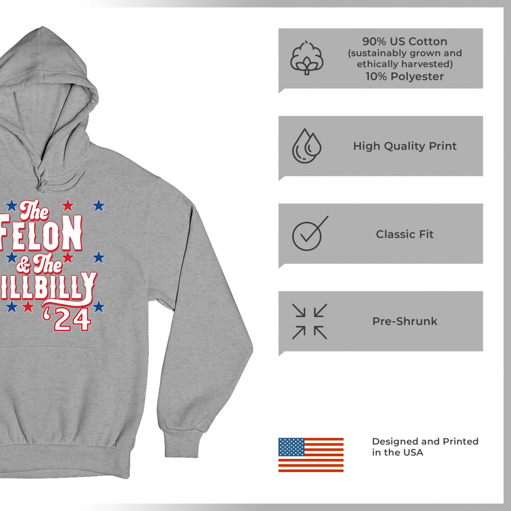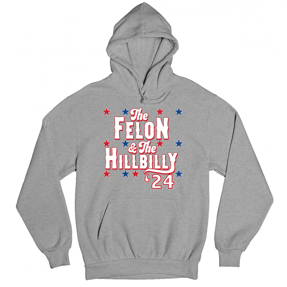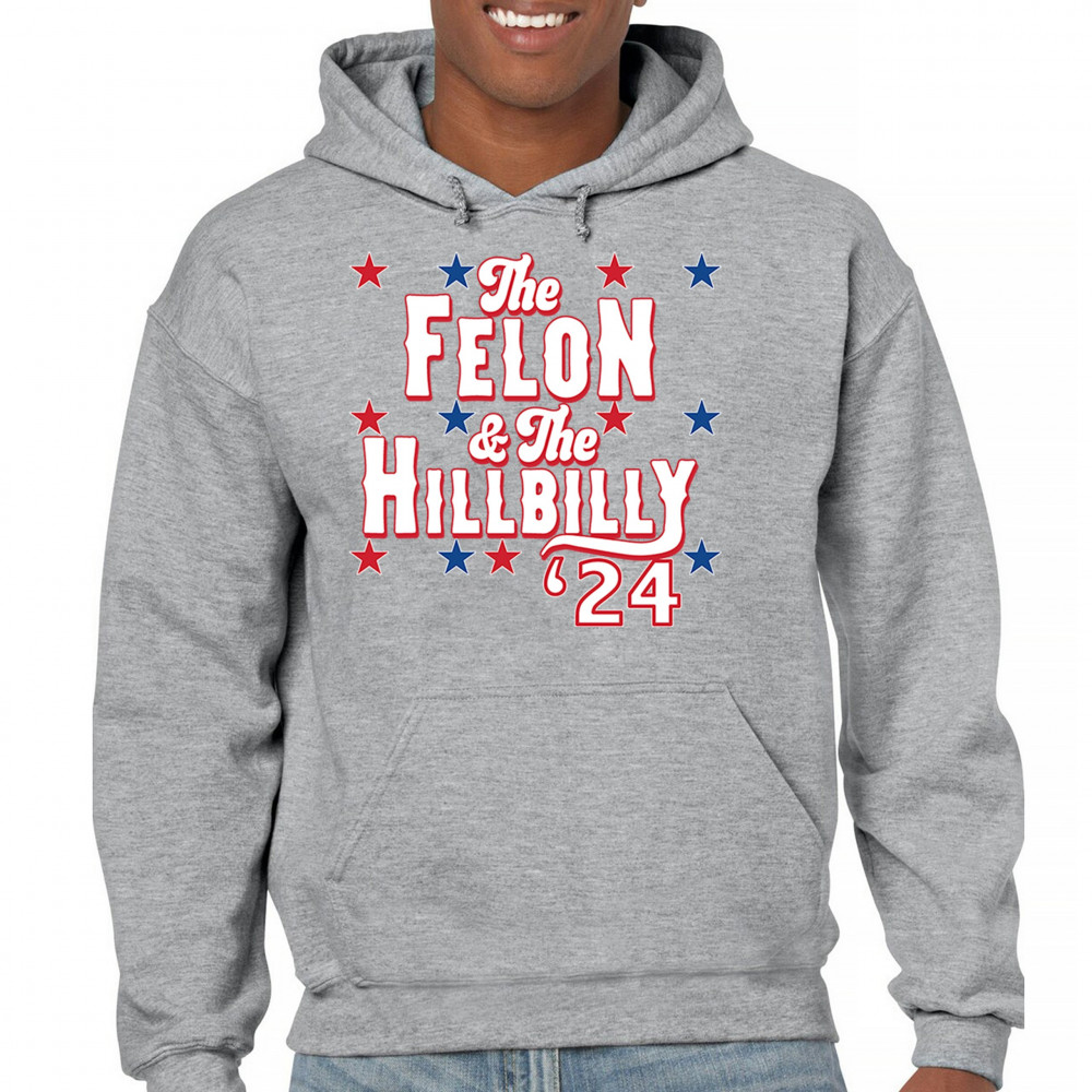 Humorous pro-Trump and Vance design for the 2024 election. "The Felon & The Hillbilly '24" captures conservative pride and humor in one bold statement.