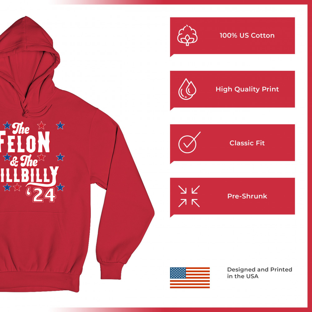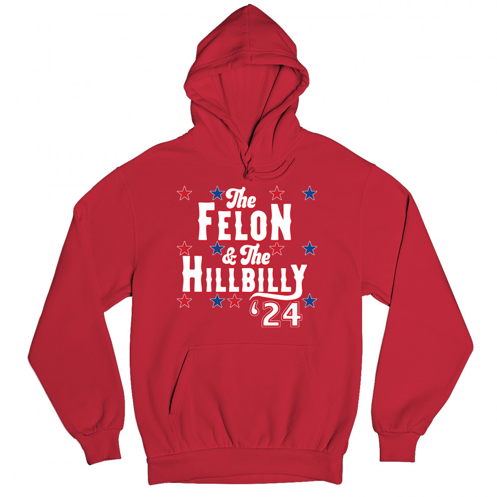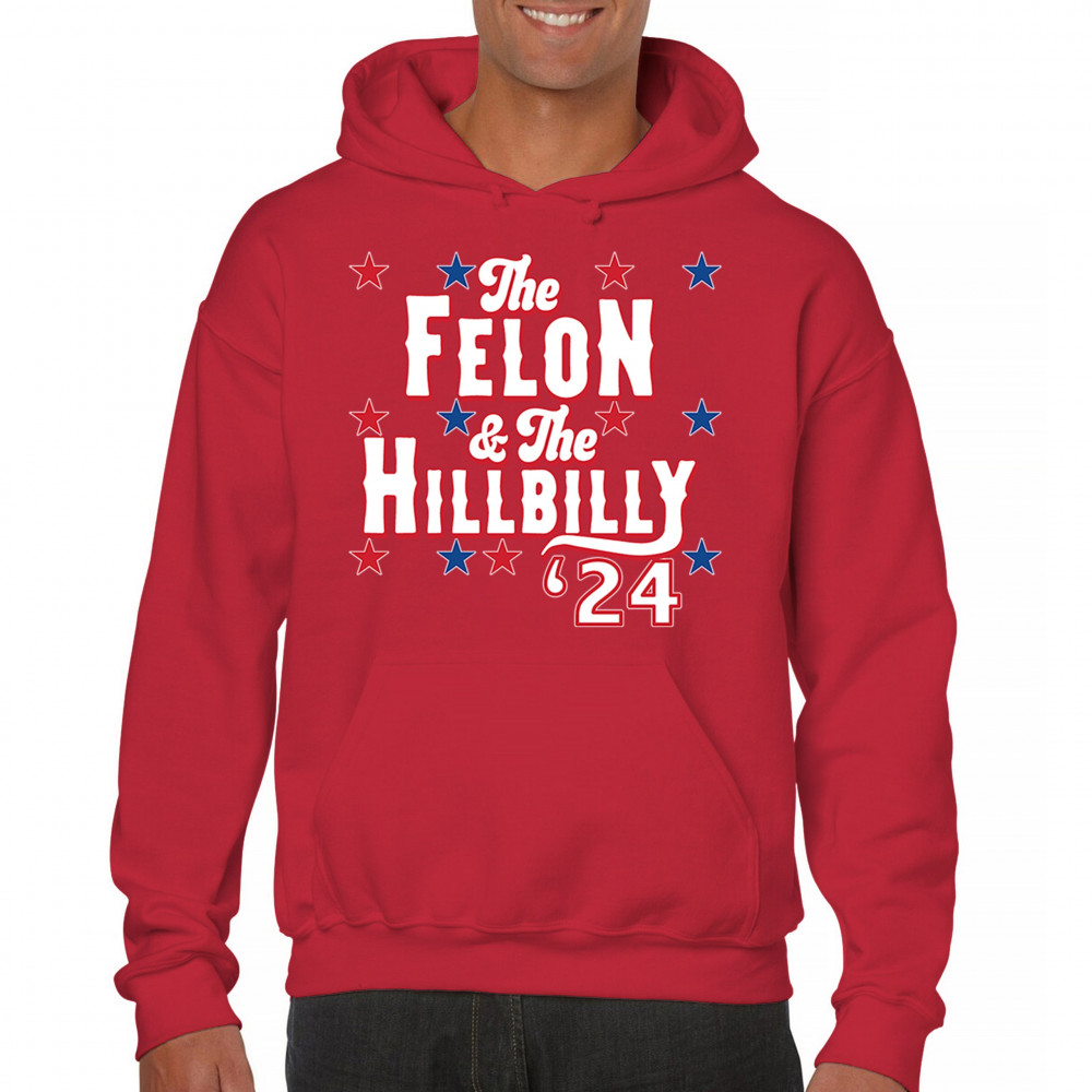 Humorous pro-Trump and Vance design for the 2024 election. "The Felon & The Hillbilly '24" captures conservative pride and humor in one bold statement.