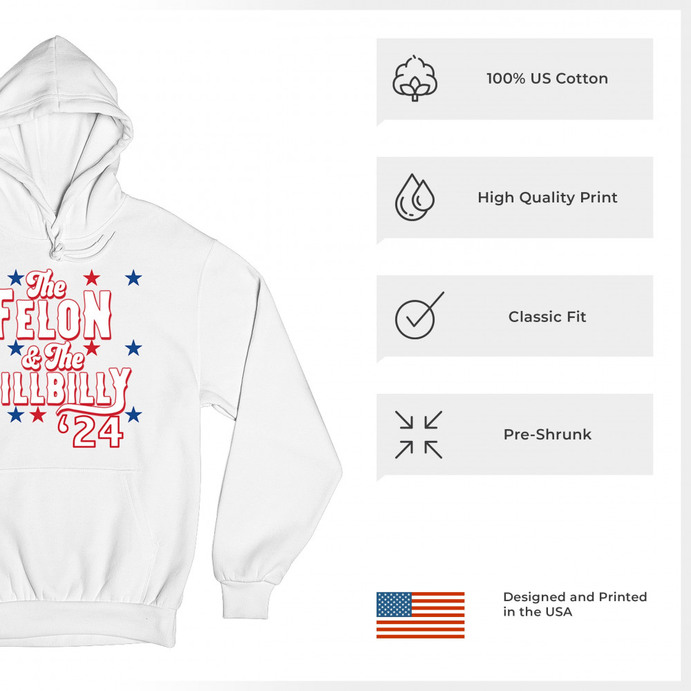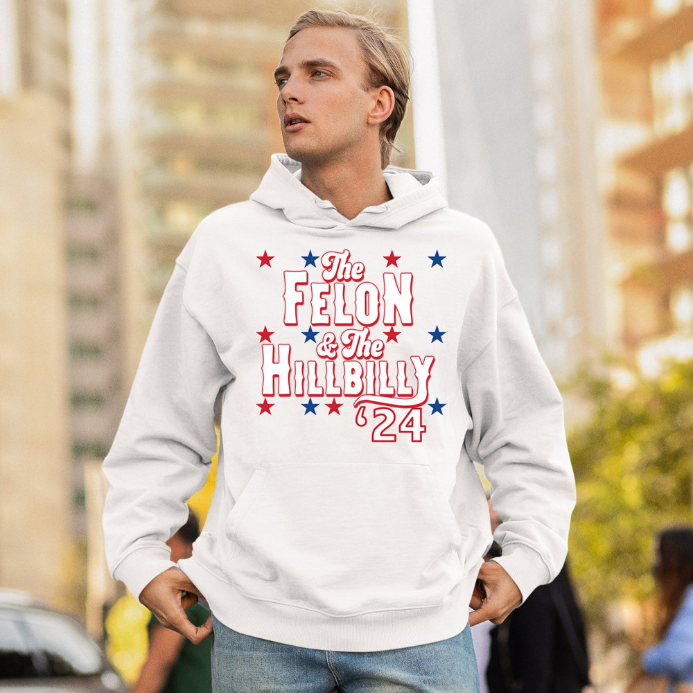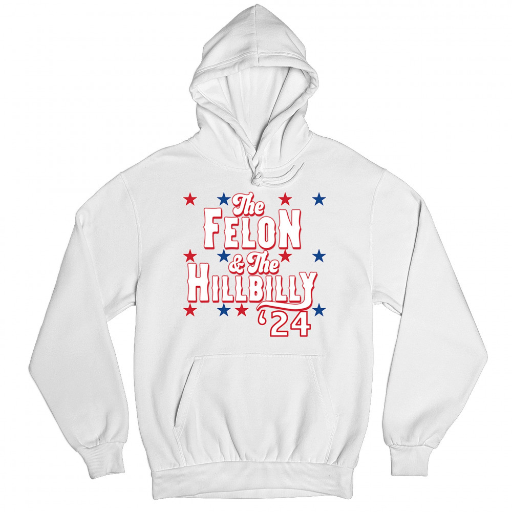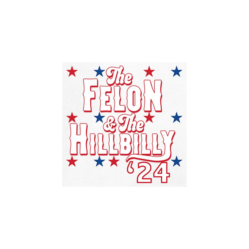 Humorous pro-Trump and Vance design for the 2024 election. "The Felon & The Hillbilly '24" captures conservative pride and humor in one bold statement.