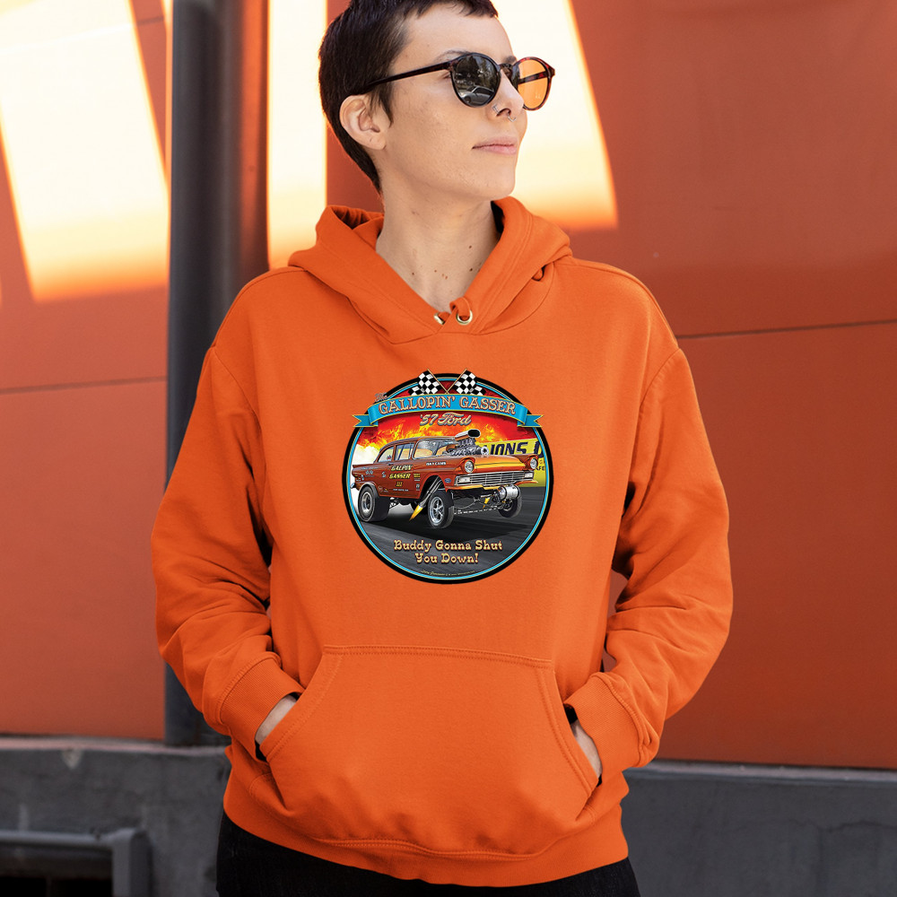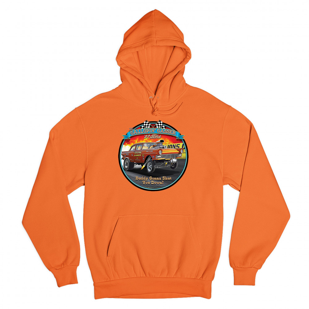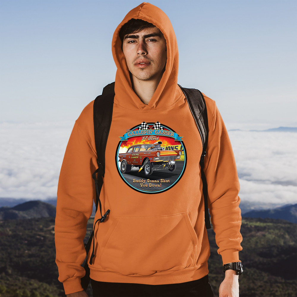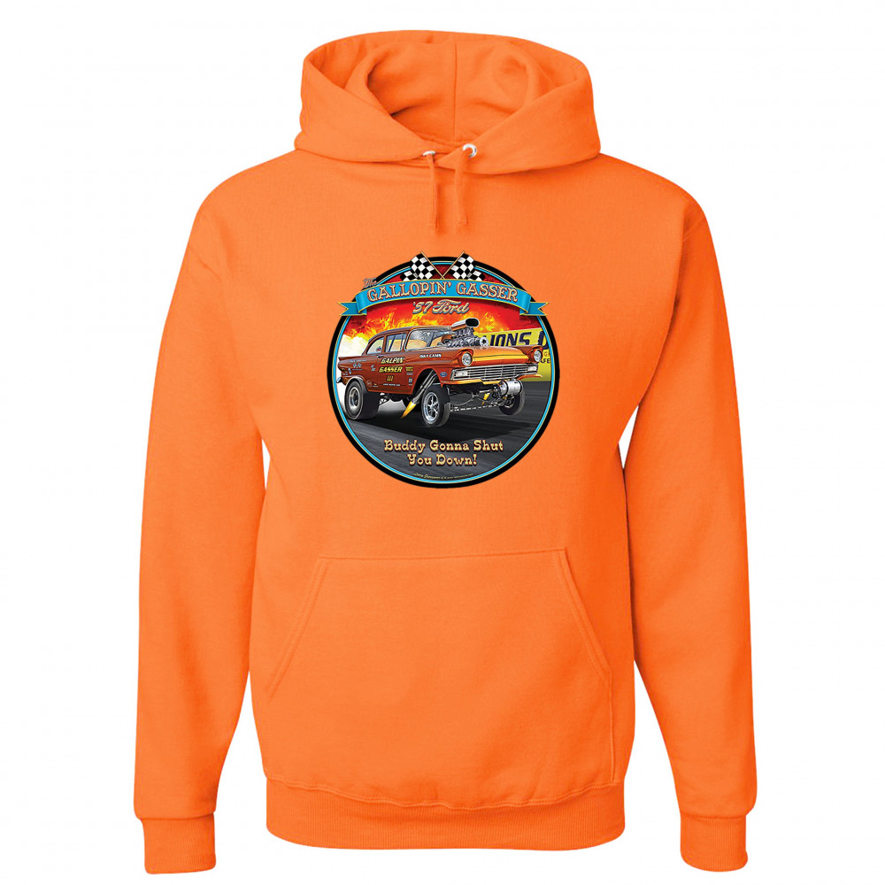 A print featuring a supercharged Ford Gasser sprinting on it's rear wheels in a drag race leaving burning tracks behind it. The print also features a pair of racing flags and says: "The Gallopin' Gasser '57 Ford" and "Buddy Gonna Shut You Down!". A great