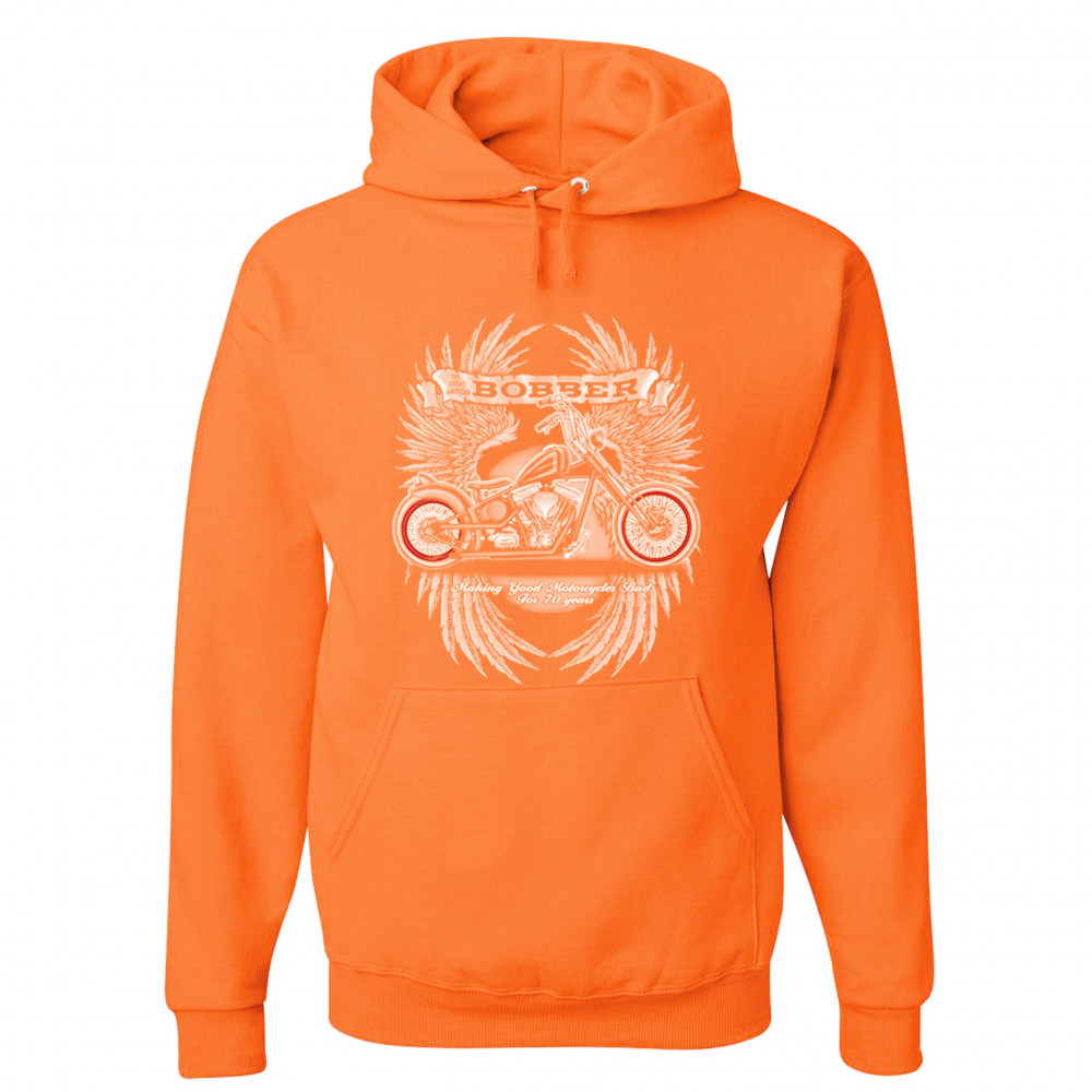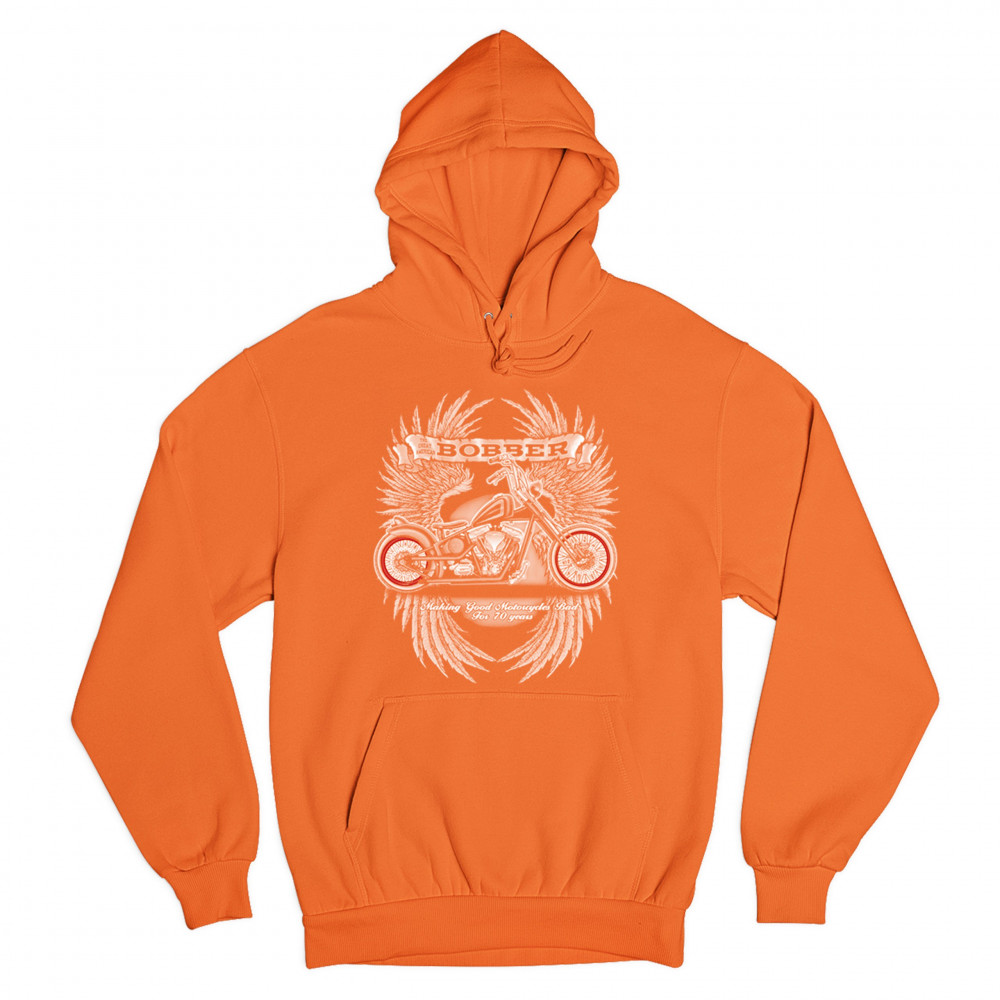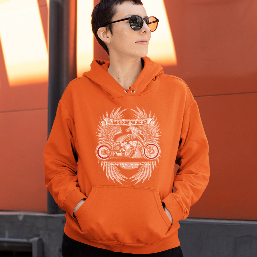 A print featuring a bobber motorcycle and a pair of wings in the background. At the top there is a stripe with "The great American bobber" written on it. At the bottom the print says: "making good motorcycles bad for 70 years". A great choice for a motorc